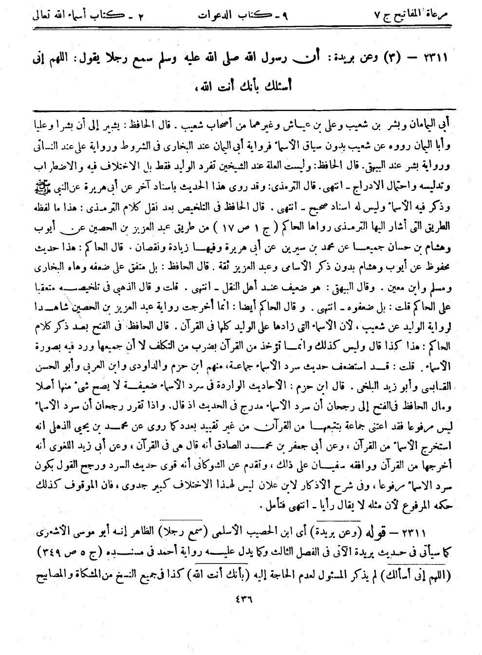 2311- قوله: (وعن بريدة) أي ابن الحصيب الأسلمي (سمع رجلاً) الظاهر إنه أبوموسى الأشعري كما سيأتي في حديث بريدة الآتي في الفصل الثالث وكما يدل عليه رواية أحمد في مسنده (ج5ص349) (اللهم إني أسألك) لم يذكر المسئول لعدم الحاجة إليه (بأنك أنت الله) كذا في جميع النسخ من المشكاة والمصابيح