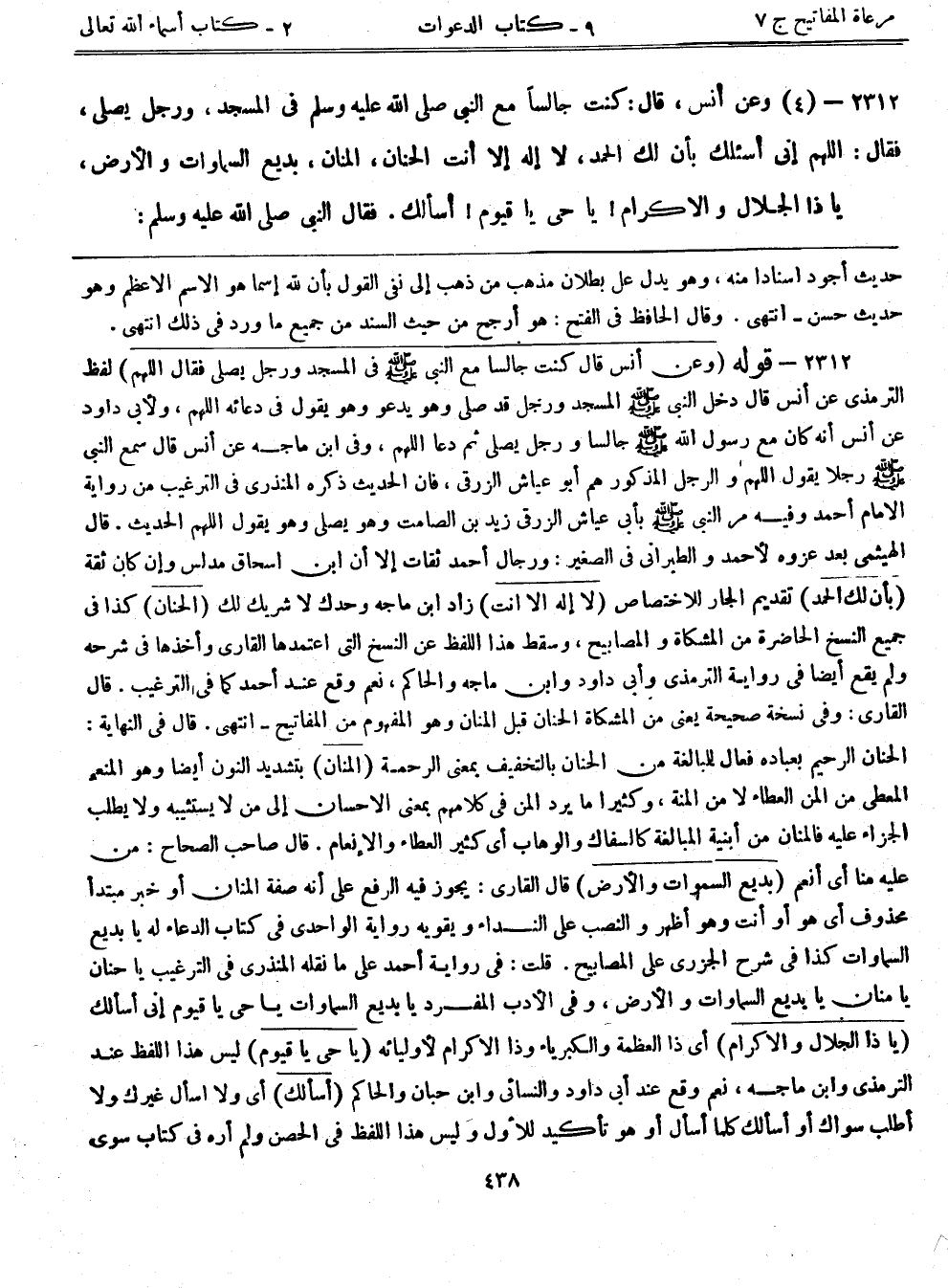 2312- قوله: (وعن أنس قال كنت جالساً مع النبي - صلى الله عليه وسلم - في المسجد ورجل يصلي فقال اللهم) لفظ الترمذي عن أنس قال دخل النبي - صلى الله عليه وسلم - المسجد ورجل قد صلى وهو يدعو وهو يقول في دعائه اللهم، ولأبي داود عن أنس أنه كان مع رسول الله - صلى الله عليه وسلم - جالساً ورجل يصلي ثم دعا اللهم، وفي ابن ماجه عن أنس قال سمع النبي - صلى الله عليه وسلم - رجلاً يقول اللهم والرجل المذكور هم أبوعياش الزرقي، فإن الحديث ذكره المنذري في الترغيب من رواية الإمام أحمد وفيه مر النبي - صلى الله عليه وسلم - بأبي عياش الزرقي بن الصامت وهو يصلي وهو يقول اللهم الحديث. قال الهيثمي بعد عزوه لأحمد والطبراني في الصغير: ورجال أحمد ثقات إلا أن ابن إسحاق مدلس وإن كان ثقة (بأن لك الحمد) تقديم الجار للاختصاص (لا إله إلا أنت) زاد ابن ماجه وحدك لا شريك لك (الحنان) كذا في جميع النسخ الحاضرة من المشكاة والمصابيح، وسقط هذا اللفظ عن النسخ التي اعتمدها القاري وأخذها في شرحه ولم يقع أيضاً في رواية الترمذي وأبي داود وابن ماجه والحاكم، نعم وقع عند أحمد كما في الترغيب. قال القاري: وفي نسخة صحيحة يعني من المشكاة الحنان قبل المنان وهو المفهوم من المفاتيح – انتهى. قال في النهاية: الحنان الرحيم بعباده فعال للمبالغة من الحنان بالتخفيف بمعنى الرحمة (المنان) بتشديد النون أيضاً وهو المنعم المعطي من المن العطاء لا من المنة، وكثيراً ما يرد المن في كلامهم بمعنى الإحسان إلى من لا يستثيبه ولا يطلب الجزاء عليه فالمنان من أبنية المبالغة كالسفاك والوهاب أي كثير العطاء والإنعام. قال صاحب الصحاح: من عليه مناً أي أنعم (بديع السماوات والأرض) قال القاري: يجوز فيه الرفع على أنه صفة المنان أو خبر المبتدأ محذوف أي هو أو أنت وهو أظهر والنصب على النداء ويقويه رواية الواحدي في كتاب الدعاء له يا بديع السماوات كذا في شرح الجزري على المصابيح. قلت: في رواية أحمد على ما نقله المنذري في الترغيب يا حنان يا منان يا بديع السماوات والأرض، وفي الأدب المفرد يا بديع السماوات يا حي يا قيوم إني أسألك (يا ذا الجلال والإكرام) أي ذا العظمة والكبرياء وذا الإكرام لأوليائه (يا حي يا قيوم) ليس هذا اللفظ عند الترمذي وابن ماجه، نعم وقع عند أبي داود والنسائي وابن حبان والحاكم (أسألك) أي ولا أسأل غيرك ولا أطلب سواك أو أسألك كلما أسأل أو هو تأكيد للأول وليس هذا اللفظ في الحصن ولم أره في كتاب سوى