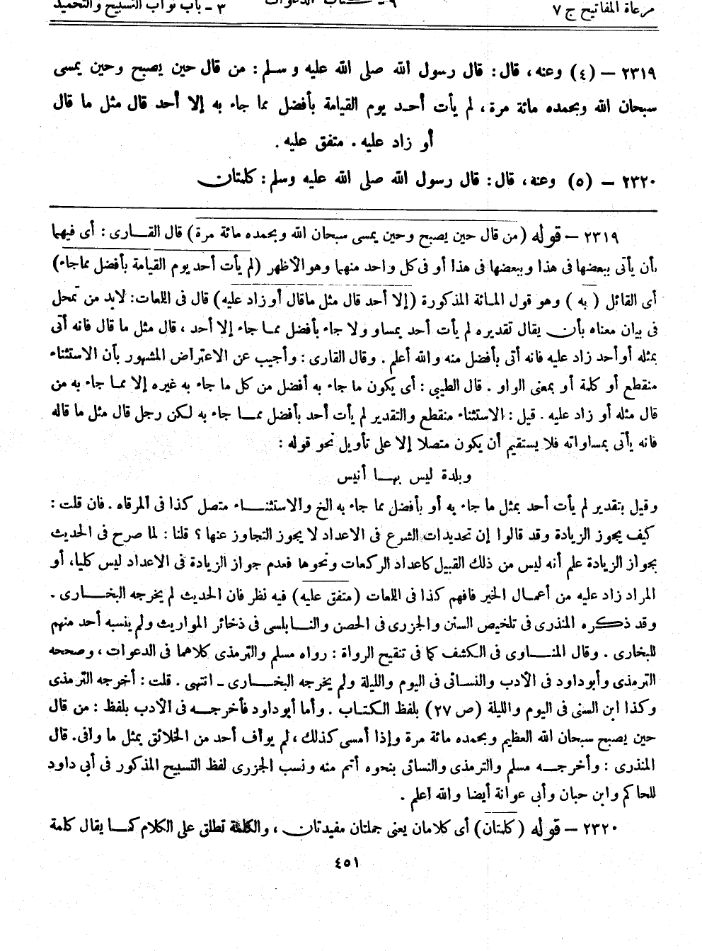 2319- قوله: (من قال حين يصبح وحين يمسي سبحان الله وبحمده مائة مرة) قال القاري: أي فيهما بأن يأتي ببعضها في هذا وببعضها في هذا أو في كل واحد منهما وهو الأظهر (لم يأت أحد يوم القيامة بأفضل مما جاء) أي القائل (به) وهو قول المائة المذكورة (إلا أحد قال مثل ما قال أو زاد عليه) قال في اللمعات: لا بد من تمحل في بيان معناه بأن يقال تقديره لم يأت أحد بمساو ولا جاء بأفضل مما جاء إلا أحد، قال مثل ما قال فإنه أتى بمثله أو أحد زاد عليه فإنه أتى بأفضل منه والله أعلم. وقال القاري: وأجيب عن الإعتراض المشهور بأن الاستثناء منقطع أو كلمة أو بمعنى الواو. قال الطيبي: أي يكون ما جاء به أفضل من كل ما جاء به غيره إلا مما جاء به من قال مثله أو زاد عليه. قيل: الاستثناء منقطع والتقدير لم يأت أحد بأفضل مما جاء به لكن رجل قال مثل ما قاله فإنه يأتي بمساواته فلا يستقيم أن يكون متصلاً إلا على تأويل نحو قوله: