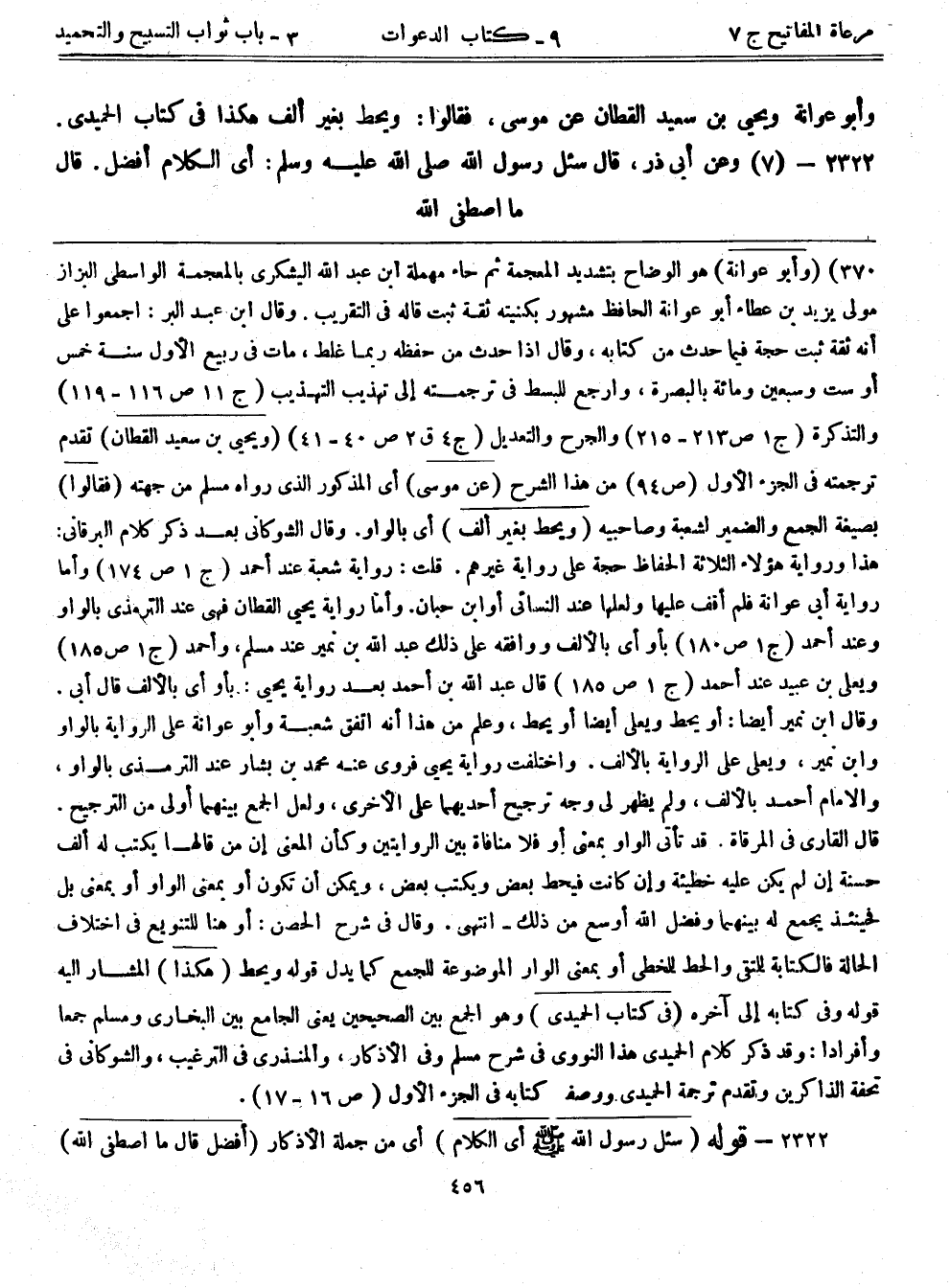 2322- (7) وعن أبي ذر، قال سأل رسول الله صلى الله عليه وسلم: أي الكلام أفضل. ((قال ما اصطفى الله