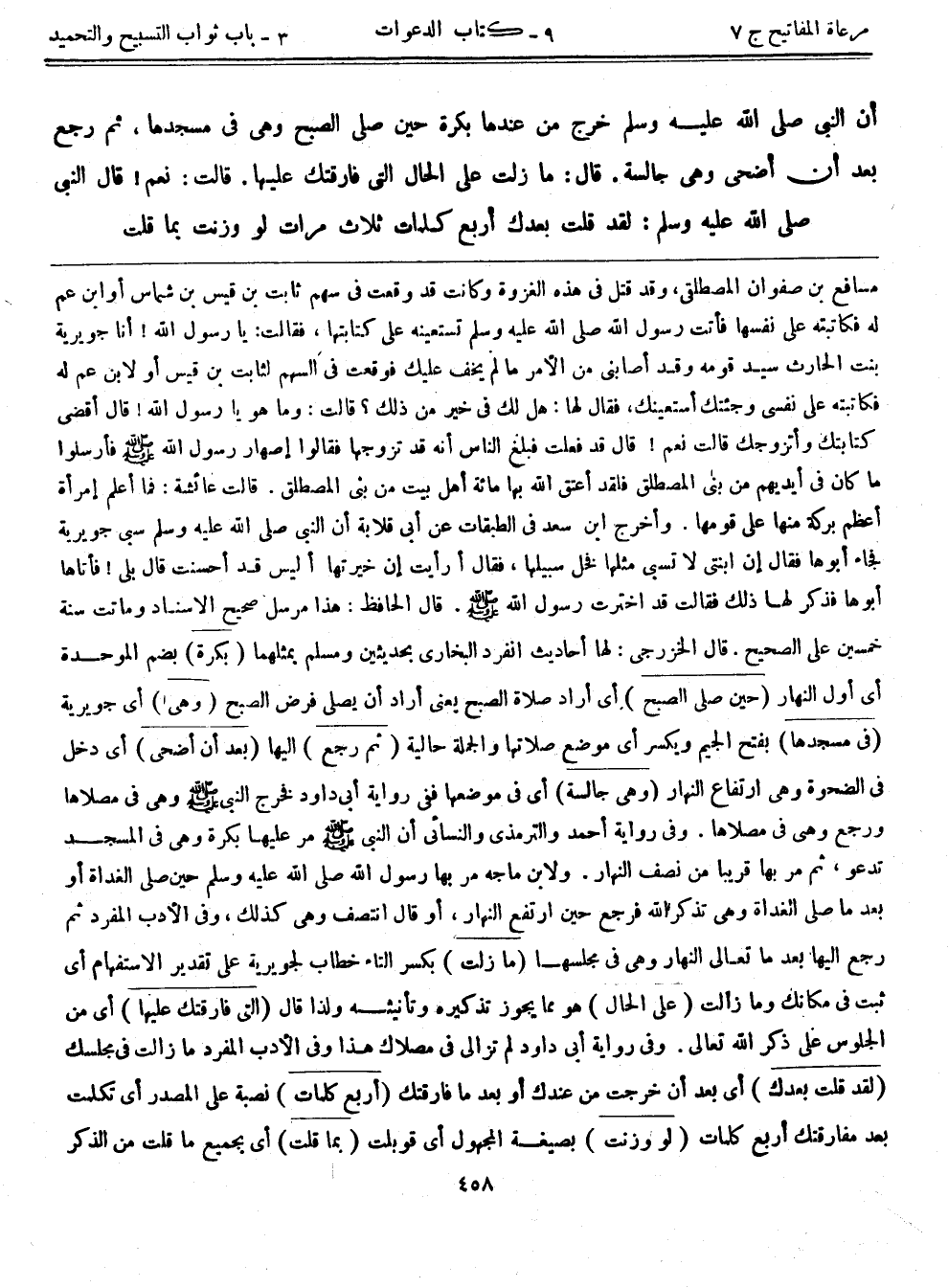 ((أن النبي صلى الله عليه وسلم خرج من عندنا بكرة حين صلى الصبح وهي في مسجدها، ثم رجع بعد أن أضحى وهي جالسة. قال: ما زلت على الحال التي فارقتك عليها. قالت: نعم! قال لنبي صلى الله عليه وسلم: لقد قلت بعدك أربع كلمات ثلاث مرات لو وزنت بما قلت