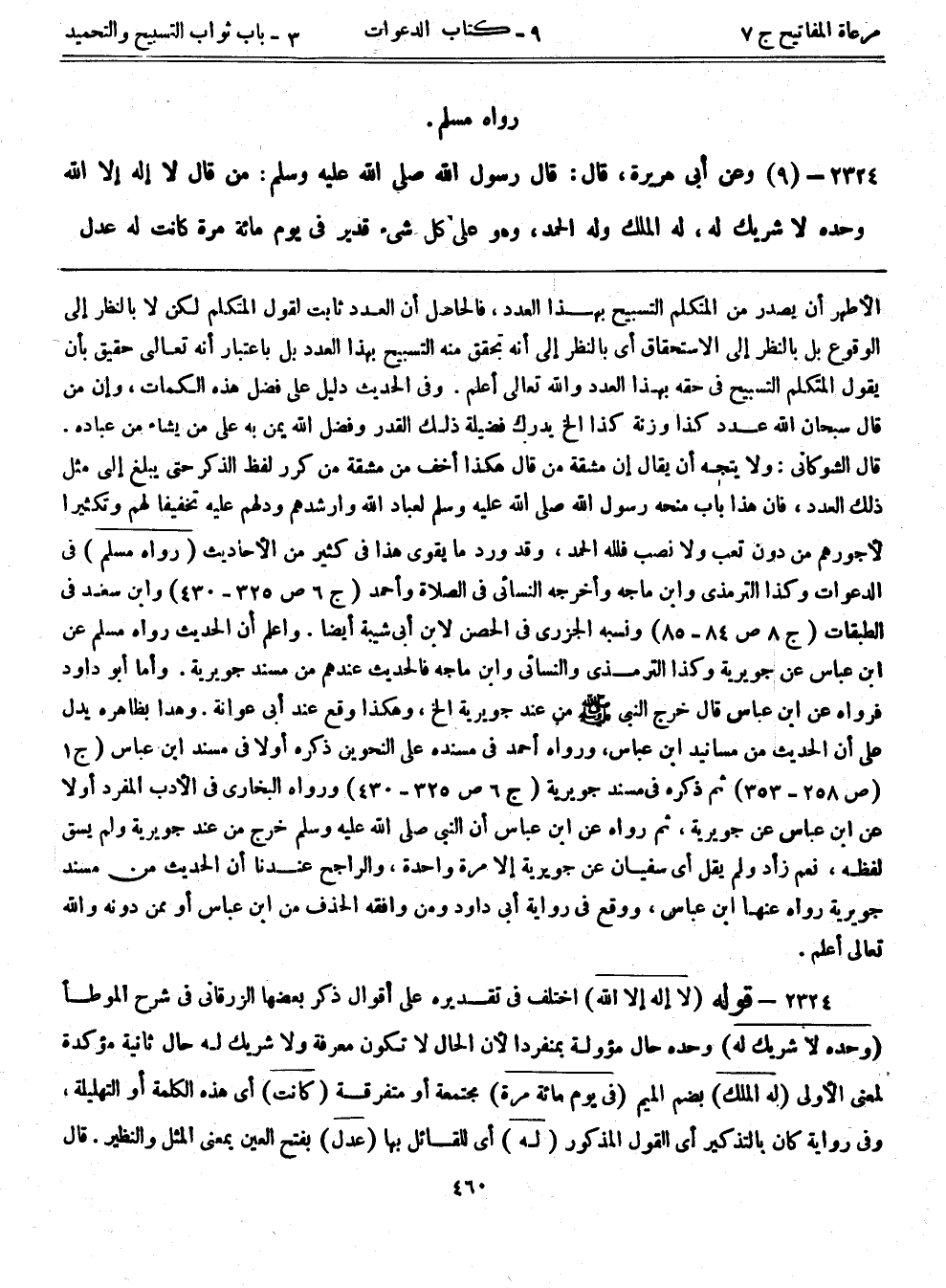 2324- (9) وعن أبي هريرة، قال: قال رسول الله صلى الله عليه وسلم: ((من قال لا إله إلا الله وحده لا شريك له، له الملك وله الحمد، وهو على كل شيء قدير في يوم مائة مرة كانت له عدل