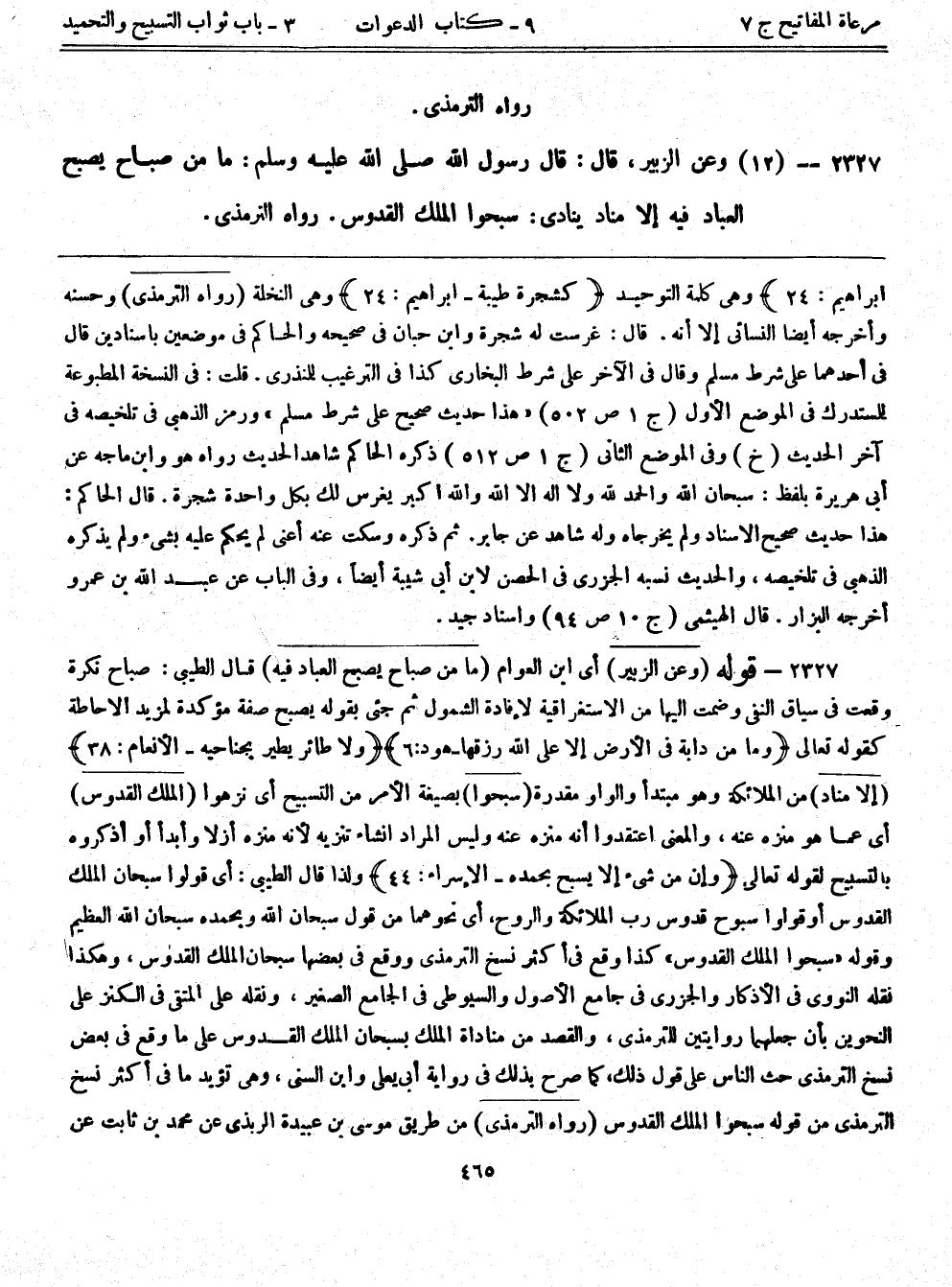 2327- (12) وعن الزبير، قال: قال رسول الله صلى الله عليه وسلم: ((ما من صباح يصبح العباد فيه إلا مناد ينادي: سبحوا الملك القدوس)) . رواه الترمذي.