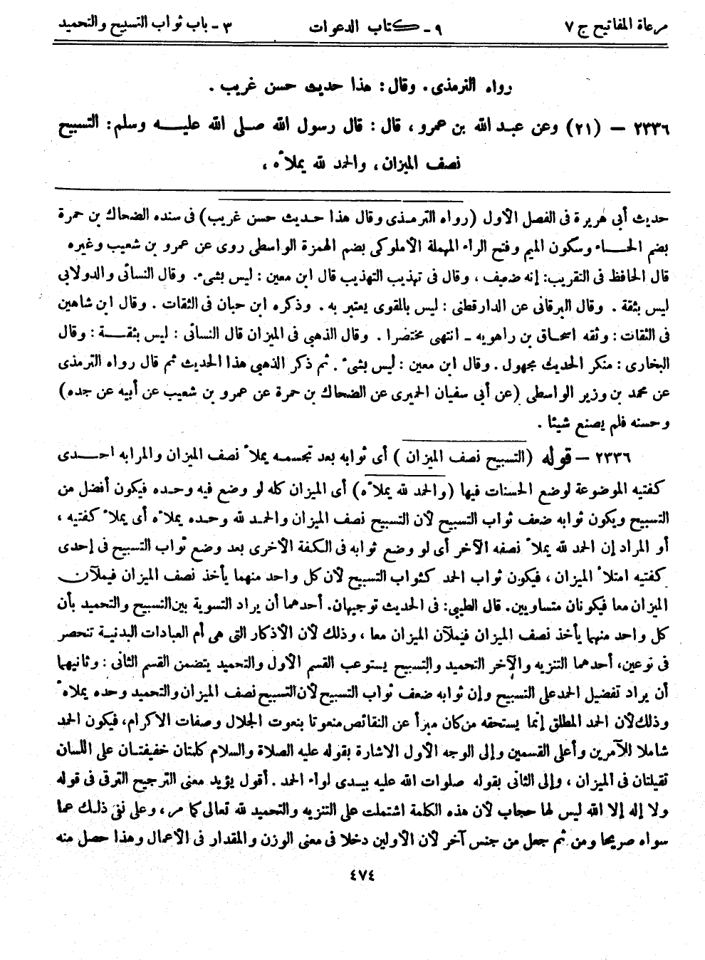 2336- (21) وعن عبد الله بن عمرو، قال: قال رسول الله صلى الله عليه وسلم: ((التسبيح نصف الميزان، والحمد لله يملأه،