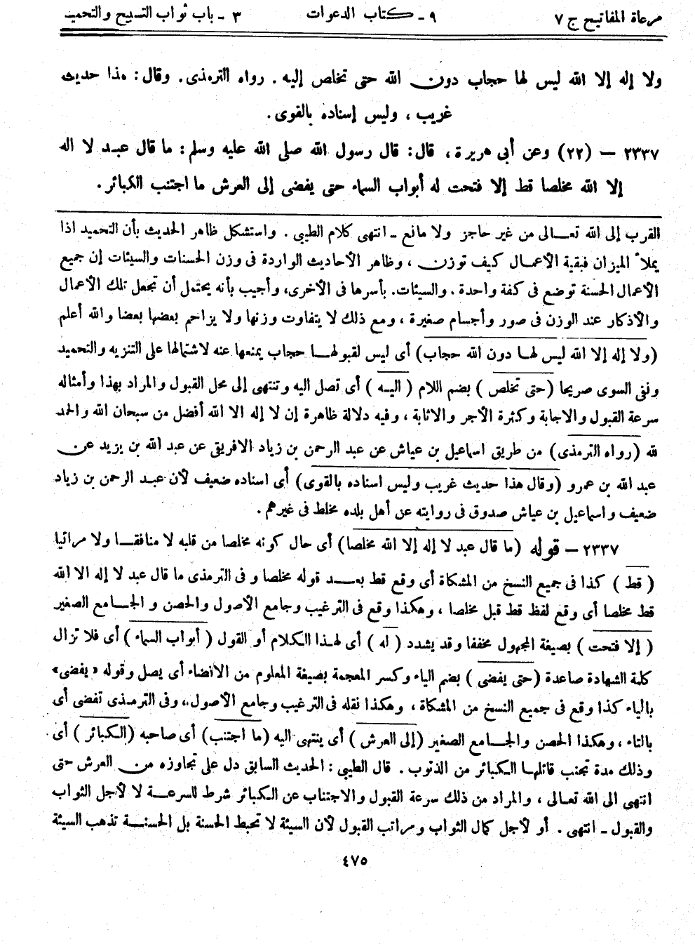 2337- قوله: (ما قال عبدلاإله إلا الله مخلصاً) أي حال كونه مخلصاً من قلبه لا منافقاً ولا مرائياً (قط) كذا في جميع النسخ من المشكاة أي وقع قط بعد قوله مخلصاً وفي الترمذي ما قال عبد لا إله إلا الله قط مخلصاً أي وقع لفظ قط قبل مخلصاً، وهكذا وقع في الترغيب وجامع الأصول والحصن والجامع الصغير (إلا فتحت) بصيغة المجهول مخففاً وقد يشدد (له) أي لهذا الكلام أو القول (أبواب السماء) أي فلا تزال كلمة الشهادة صاعدة (حتى يفضي) بضم الياء وكسر المعجمة بصيغة المعلوم من الإفضاء أي يصل وقوله "يفضي" بالياء كذا وقع في جميع النسخ من المشكاة، وهكذا نقله في الترغيب وجامع الأصول، وفي الترمذي تفضي أي بالتاء، وهكذا الحصن والجامع الصغير (إلى العرش) أي ينتهي إليه (ما اجتنب) أي صاحبه (الكبائر) أي وذلك مدة تجنب قائلها الكبائر من الذنوب. قال الطيبي: الحديث السابق دل على تجاوزه من العرش حتى انتهى إلى الله تعالى، والمراد من ذلك سرعة القبول والاجتناب عن الكبائر شرط للسرعة لا لأجل الثواب والقبول – انتهى. أو لأجل كمال الثواب ومراتب القبول لأن السيئة لا تحبط الحسنة بل الحسنة تذهب السيئة
