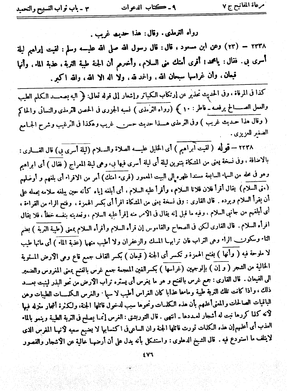 2338- قوله (لقيت إبراهيم) أي الخليل عليه الصلاة والسلام (ليلة أسري بي) قال القاري: بالإضافة، وفي نسخة يعني من المشكاة بتنوين ليلة أي ليلة أسري فيها بي، وهي ليلة المعراج (فقال) أي إبراهيم وهو في محله من السماء السابعة مسنداً ظهره إلى البيت المعمور (قريء أمتك) أمر من الإقراء أي بلغهم وأوصلهم (مني السلام) يقال أقرأ فلان فلاناً السلام، وأقرأ عليه السلام، أي أبلغه إياه كأنه حين يبلغه سلامه يحمله على أن يقرأ السلام ويرده. قال القاري: وفي نسخة يعني من المشكاة إقرأ أي بكسر الهمزة، وفتح الراء من القراءة، أي أبلغهم من جانبي السلام، وفيه ما قيل إنه يقال في الأمر منه إقرأ عليه السلام، وتعديته بنفسه خطأ، فلا يقال اقرأه السلام. قال القاري لكن في الصحاح والقاموس إن قرأه السلام وأقرأه السلام بمعنى (طيبة التربة) بضم التاء وسكون الراء وهي التراب فإن ترابها المسك والزعفران ولا أطيب منهما (عذبة الماء) أي مائها طيب لا ملوحة فيه (وأنها) بفتح الهمزة وتكسر أي الجنة (قيعان) بكسر القاف جمع قاع وهي الأرض المستوية الخالية من الشجر (وإن) بالوجهين (غراسها) بكسر الغين المعجمة جمع غرس بالفتح بمعنى المغروس والضمير إلى القيعان. قال القاري: جمع غرس بالفتح وهو ما يغرس أي يستره تراب الأرض من نحو البذر لينبت بعد ذلك، وإذا كانت تلك التربة طيبة وماءها عذاباً كان الغراس أطيب لا سيما. والغرس الكلمات الطيبات وهن الباقيات الصالحات والمعنى أعلمهم بأن هذه الكلمات ونحوها سبب لدخول قائلها الجنة، ولكثرة أشجار منزله فيها لأنه كلما كررها نبت له أشجار لعددها – انتهى. قال التوربشتي: الغرس إنما يصلح في التربة الطيبة وينمو بالماء العذب أي أعلمهم إن هذه الكلمات تورث قائلها الجنة وإن الساعي في اكتسابها لا يضيع سعيه لأنها المغرس الذي لا يتلف ما استودع فيه. قال الشيخ الدهلوي: واستشكل بأنه يدل على أن أرضها خالية عن الأشجار والقصور