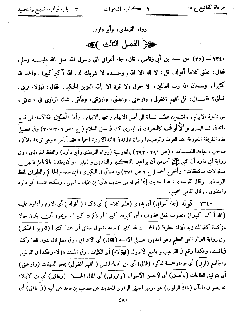 2340- قوله: (جاء أعرابي) أي بدوي (علمني كلاما) أي ذكراً (أقوله) أي ألازم وأداوم عليه (الله أكبر كبيراً) منصوب بفعل محذوف، أي كبرت كبيراً أو ذكرت كبيراً، ويجوز أن يكون حالا مؤكدة كقولك زيد أبوك عطوفاً (والحمد لله كثيراً) صفة مفعول مطلق أي حمداً كثيراً (العزيز الحكيم) وفي رواية البزار العلي العظيم وهو المشهور على الألسنة (فقال) أي الأعرابي، وفي مسلم قال بدون الفاء وكذا في المسند، وهكذا وقع في الترغيب وجامع الأصول (فهؤلاء) أي الكلمات وفي المسند هؤلاء وهكذا في الترغيب والجامع (لربي) أي موضوعة لذكره (فمالي) أي من الدعاء لنفسي (اللهم اغفر لي) بمحو السيئات (وارحمني) أي بتوفيق الطاعات (واهدني) أي لأحسن الأحوال (وارزقني) أي المال الحلال (وعافني) أي من الابتلاء بما يضر في المال (شك الراوي) هو موسى الجهني الراوي للحديث عن مصعب بن سعد عن أبيه (في عافني) أي