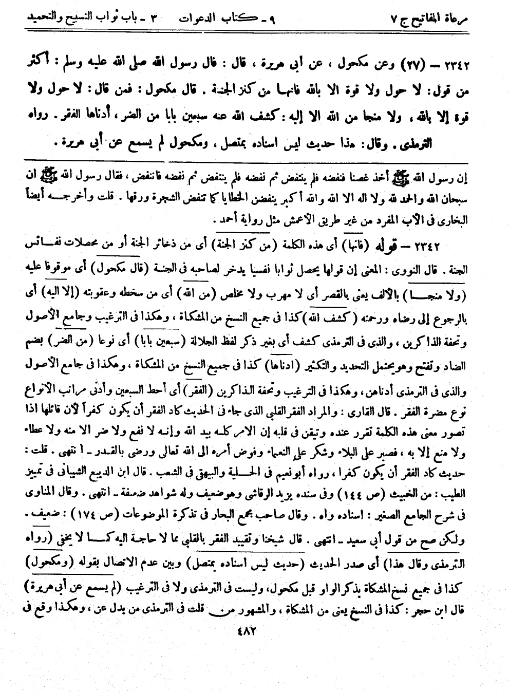 2342- قوله: (فإنها) أي هذه الكلمة (من كنز الجنة) أي من ذخائر الجنة أو من محصلات نفائس الجنة. قال النووي: المعنى إن قولها يحصل ثواباً نفسياً يدخر لصاحبه في الجنة (قال مكحول) أي موقوفاً عليه (ولا منجا) بالألف يعني بالقصر أي لا مهرب ولا مخلص (من الله) أي من سخطه وعقوبته (إلا إليه) أي بالرجوع إلى رضاه ورحمته (كشف الله) كذا في جميع النسخ من المشكاة، وهكذا في الترغيب وجامع الأصول وتحفة الذاكرين، والذي في الترمذي كشف أي بغير ذكر لفظ الجلالة (سبعين بابا) أي نوعا (من الضر) بضم الضاد وتفتح وهو يحتمل التحديد والتكثير (أدناها) كذا في جميع النسخ من المشكاة، وهكذا في جامع الأصول والذي في الترمذي أدناهن، وهكذا في الترغيب وتحفة الذاكرين (الفقر) أي أحط السبعين وأدنى مراتب الأنواع نوع مضرة الفقر. قال القاري: والمراد الفقر القلبي الذي جاء في الحديث كاد الفقر أن يكون كفراً لأن قائلها إذا تصور معنى هذه الكلمة تقرر عنده وتيقن في قلبه إن الأمر كله بيد الله وإنه لا نفع ولا ضر إلا منه ولا عطاء ولا منع إلا به، فصبر على البلاء وشكر على النعماء وفوض أمره إلى الله تعالى ورضي بالقدر – انتهى. قلت: حديث كاد الفقر أن يكون كفراً، رواه أبونعيم في الحلية والبيهقي في الشعب. قال ابن الديبع الشيباني في تمييز الطيب: من الخبيث (ص144) : وفي سنده يزيد الرقاشي وهو ضعيف وله شواهد ضعيفة – انتهى. وقال المناوي في شرح الجامع الصغير: إسناده رواه. وقال صاحب مجمع البحار في تذكرة الموضوعات (ص174) ضعيف. ولكن صح من قول أبي سعيد – انتهى. قال شيخنا وتقييد الفقر بالقلبي مما لا حاجة إليه كما لا يخفى (رواه الترمذي وقال: هذا) أي صدر الحديث (حديث ليس إسناده بمتصل) وبين عدم الاتصال بقوله (ومكحول) كذا في جميع نسخ المشكاة بذكر الواو قبل مكحول، وليست في الترمذي ولا في الترغيب (لم يسمع عن أبي هريرة) قال ابن حجر: كذا في النسخ يعني من المشكاة، والمشهور من قلت في الترمذي من بدل عن، وهكذا وقع في