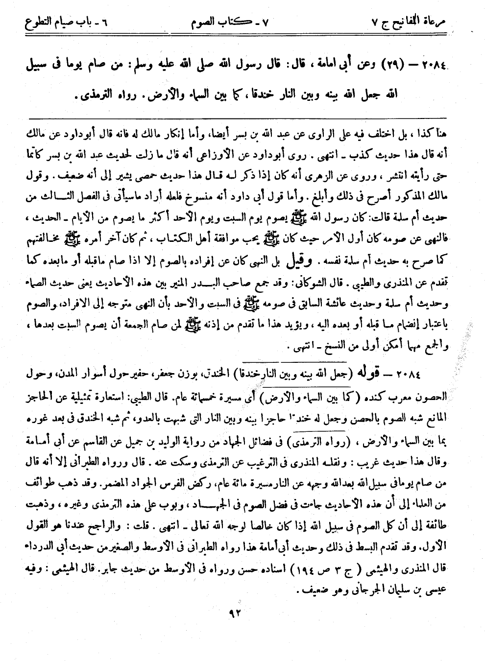 2084- (29) وعن أبي أمامة، قال: قال رسول الله صلى الله عليه وسلم: ((من صام يوماً في سبيل الله جعل الله بينه وبين النار خندقاً، كما بين السماء والأرض)) . رواه الترمذي.