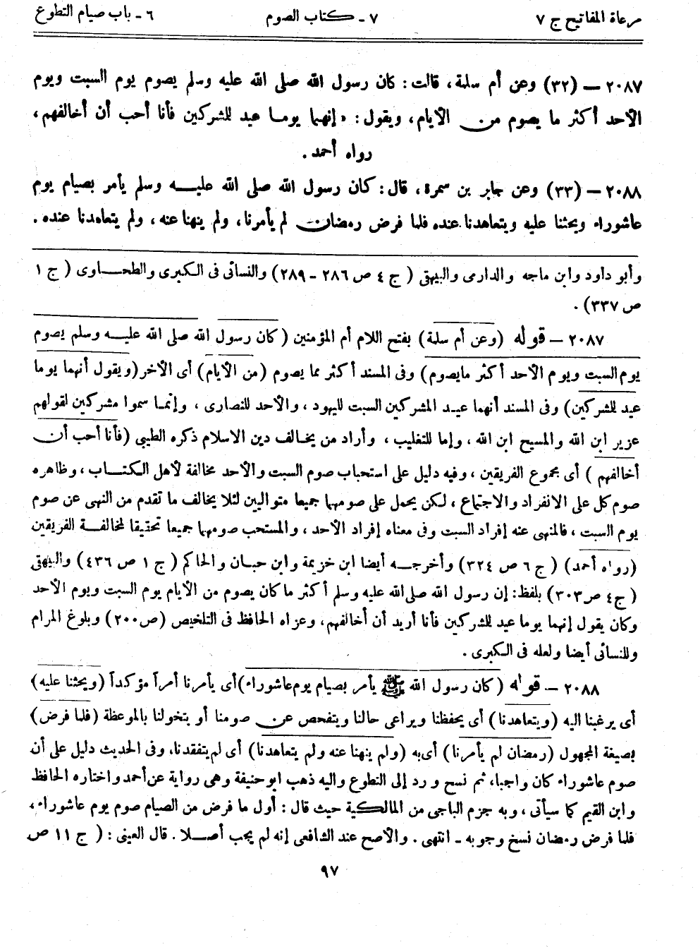 2087- (32) وعن أم سلمة، قالت: ((كان رسول الله صلى الله عليه وسلم يصوم يوم السبت ويوم الأحد أكثر ما يصوم من الأيام، ويقول: "إنهما يوماً عيد للمشركين فأنا أحب أن أخالفهم)) . رواه أحمد.