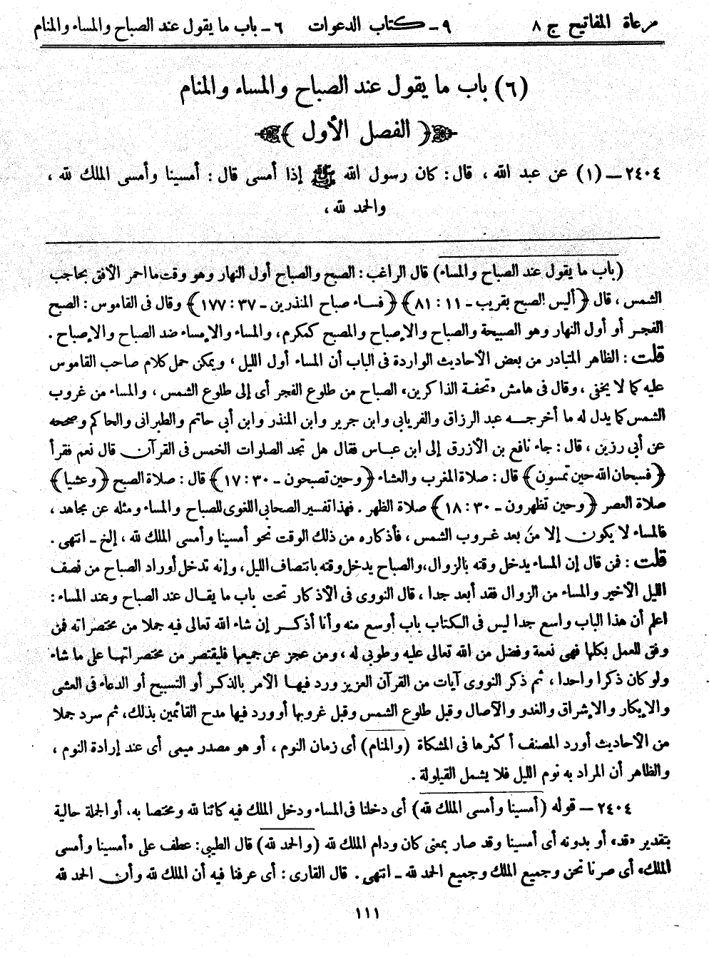 2404- (1) عن عبد الله، قال: كان رسول الله صلى الله عليه وسلم إذا أمسى قال: أمسينا وأمسى الملك لله، والحمد لله،
