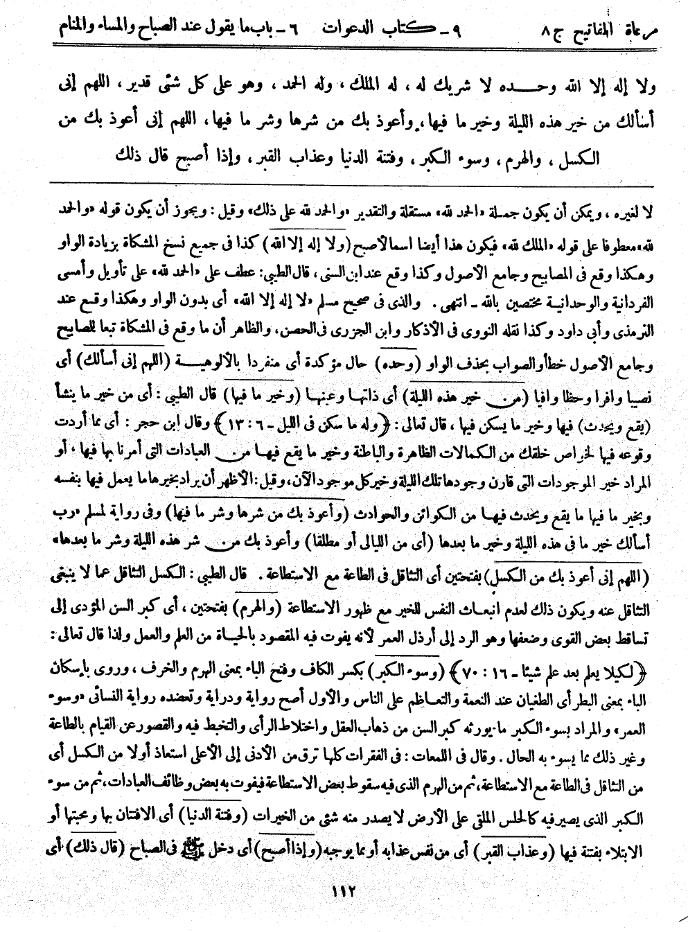 لا لغيره، ويمكن أن يكون جملة ((الحمد الله)) مستقلة والتقدير ((والحمد لله على ذلك)) وقيل: ويجوز أن يكون قوله ((والحمد لله)) معطوفًا على قوله ((الملك لله)) فيكون هذا أيضًا اسمًا لأصبح (ولا إله إلا الله) كذا في جميع نسخ المشكاة بزيادة الواو وهكذا وقع في المصابيح وجامع الأصول وكذا وقع عند ابن السني، قال الطيبي: عطف على ((الحمد لله)) على تأويل وأمسى الفردانية والوحدانية مختصين بالله - انتهى. والذي في صحيح مسلم ((لا إله إلا الله)) أي بدون الواو وهكذا وقع عند الترمذي وأبي داود وكذا نقله النووي في الأذكار وابن الجزري في الحصن، والظاهر أن ما وقع في المشكاة تبعًا للمصابيح وجامع الأصول خطأ والصواب بحذف الواو (وحده) حال مؤكدة. أي منفردًا بالألوهية (اللهم إني أسألك) أي مصيرًا وافرًا وحظًا وافيًا (من خير هذه الليلة) أي ذاتها وعينها (وخير ما فيها) قال الطيبي: أي من خير ما ينشأ (يقع ويحدث) فيها وخير ما يسكن فيها، قال تعالى: {وَلَهُ مَا سَكَنَ فِي اللَّيْلِ} (6: 13) وقال ابن حجر: أي مما أردت وقوعه فيها لخواص خلقك من الكمالات الظاهرة والباطنة وخير ما يقع فيها من العبادات التي أمرنا بها فيها، أو المراد خير الموجودات التي قارن وجودها تلك الليلة وخير كل موجود الآن. وقيل: الأظهر أن يراد بخيرها ما يعمل فيها بنفسه وبخير ما فيها ما يقع ويحدث فيها من الكوائن والحوادث (وأعوذ بك من شرها وشر ما فيها) وفي رواية لمسلم ((رب أسألك خير ما في الليلة وخير ما بعدها (أي من الليالي أو مطلقًا) وأعوذ بك من شر هذه الليلة وشر ما بعدها)) (اللهم إني أعوذ بك من الكسل) بفتحتين أي التثاقل في الطاعة مع الاستطاعة. قال الطيبي: الكسل التثاقل عما لا ينبغي التثاقل عنه، ويكون ذلك لعدم انبعاث النفس للخير مع ظهور الاستطاعة. (والهرم) بفتحتين، أي كبر السن المؤدي إلى تساقط بعض القوى وضعفها وهو الرد إلى أرذل العمر لأنه يفوت فيه المقصود بالحياة من العلم والعمل، ولذا قال تعالى: {لِكَيْ لا يَعْلَمَ بَعْدِ عِلْمٍ شَيْئاً} (16: 70) (وسوء الكِبَر) بكسر الكاف وفتح الباء بمعنى الهرم والخرف، وروي بإسكان الباء بمعنى البطر أي الطغيان عند النعمة والتعاظم على الناس. والأول أصح رواية ودراية وتعضده رواية النسائي ((وسوء العمر)) والمراد بسوء الكبر ما يورثه كبر السن من ذهاب العقل، واختلاط الرأي والتخبط فيه، والقصور عن القيام بالطاعة وغير ذلك مما يسوء الحال. وقال في اللمعات: في الفقرات كلها ترق من الأدنى إلى الأعلى استعاذ أولاً من الكسل أي من التثاقل في الطاعة مع الاستطاعة، ثم من الهرم الذي فيه سقوط بعض الاستطاعة فيفوت به بعض وظائف العبادات، ثم من سوء الكبر الذي يصير فيه كالحلس الملقى على الأرض لا يصدر منه شيء من الخيرات (وفتنة الدنيا) أي الافتتان بها ومحبتها أو الابتلاء بفتنة فيها (وعذاب القبر) أي من نفس عذابه أو مما يوجبه (وإذا أصبح) أي دخل - صلى الله عليه وسلم - في الصباح (قال ذلك) أي