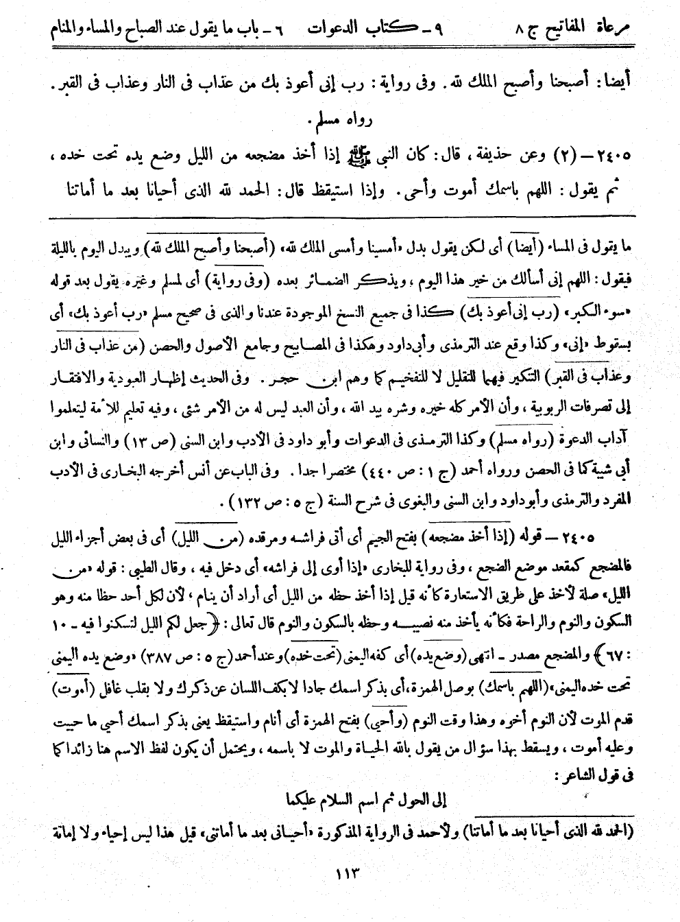 2405- (2) وعن حذيفة، قال: كان النبي صلى الله عليه وسلم إذا أخذ مضجعه من الليل وضع يده تحت خده، ثم يقول: اللهم باسمك أموت وأحيى. وإذا استيقظ قال: الحمد لله الذي أحيانا بعد ما أماتنا