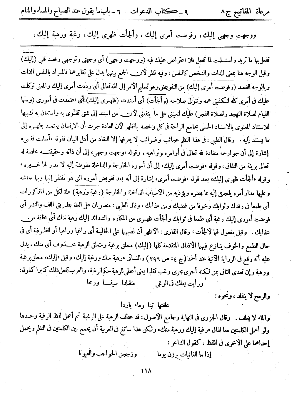 تفعل بها ما تريد واستسلمت لما تفعل فلا اعتراض عليك فيه (ووجهت وجهي) أي: وجهتي وتوجهي وقصد قلبي (إليك) وقيل: الوجه هنا بمعنى الذات والشخص كالنفس، وفيه نظر لأن الجمع بينهما يدل على تغايرهما فالمراد بالنفس الذات وبالوجه القصد (وفوضت أمري إليك) من التفويض وهو تسليم الأمر إلى الله تعالى أي: رددت أمري إليك والمعنى توكلت عليك في أمري كله لتكفيني همه وتتولى صلاحه (وألجأت) أي: أسندت (ظهري إليك) أي: اعتمدت في أموري (ومنها القيام لصلاة التهجد ولصلاة الفجر) عليك لتعينني على ما ينفعني لأن من استند إلى شيء تقوَّى به واستعان به تشبيهًا للاستناد المعنوي بالاستناد الحسي بجامع الراحة في كل وخصه بالظهر لأن العادة جرت أن الإنسان يعتمد بظهره إلى ما يستند إليه. وقال الطيبي: في هذا النظم عجائب وغرائب لا يعرفها إلا النقاد من أهل البيان فقوله: ((أسلمت نفسي)) إشارة إلى أن جوارحه منقادة لله تعالى في أوامره ونواهيه، وقوله: ((وجهت وجهي)) إلى أن ذاته وحقيقته مخلصة له تعالى بريئة من النفاق. وقوله: ((فوضت أمري إليك)) إلى أن أموره الخارجة والداخلة مفوضة إليه لا مدبر لها غيره. وقوله: ((ألجأت ظهري إليك)) بعد قوله: ((فوضت أمري)) إشارة إلى أنه بعد تفويض أموره التي هو مفتقر إليها وبها معاشه وعليها مدار أمره يلتجئ إليه مما يضره ويؤذيه من الأسباب الداخلة والخارجة (رغبة ورهبة) علة لكل من المذكورات أي: طمعًا في رفدك وثوابك وخوفًا من غضبك ومن عذابك. وقال الطيبي: منصوبان على العلة بطريق اللف والنشر أي: فوضت أموري إليك رغبة أي: طمعًا في ثوابك وألجأت ظهري من المكاره والشدائد إليك رهبة منك أي: محافة من عذابك. وقيل: مفعول لهما لألجأت. وقال القاري: الأظهر أن نصبهما على الحالية أي: راغبًا وراهبًا أو الظرفية أي: في حال الطمع والخوف يتنازع فيهما الأفعال المتقدمة كلها. (إليك) متعلق برغبة ومتعلق الرهبة محذوف أي: منك، يدل عليه أنه وقع في الرواية الآتية عند أحمد (ج4: ص296) ، والنسائي ((رهبة منك ورغبة إليك)) ، وقيل: ((إليك)) متعلق برغبة ورهبة وإن تعدى الثاني بمن لكنه أجرى مجرى رغب تغليبًا يعني أعطى للرهبة حكم الرغبة، والعرب تفعل ذلك كثيرًا كقوله: