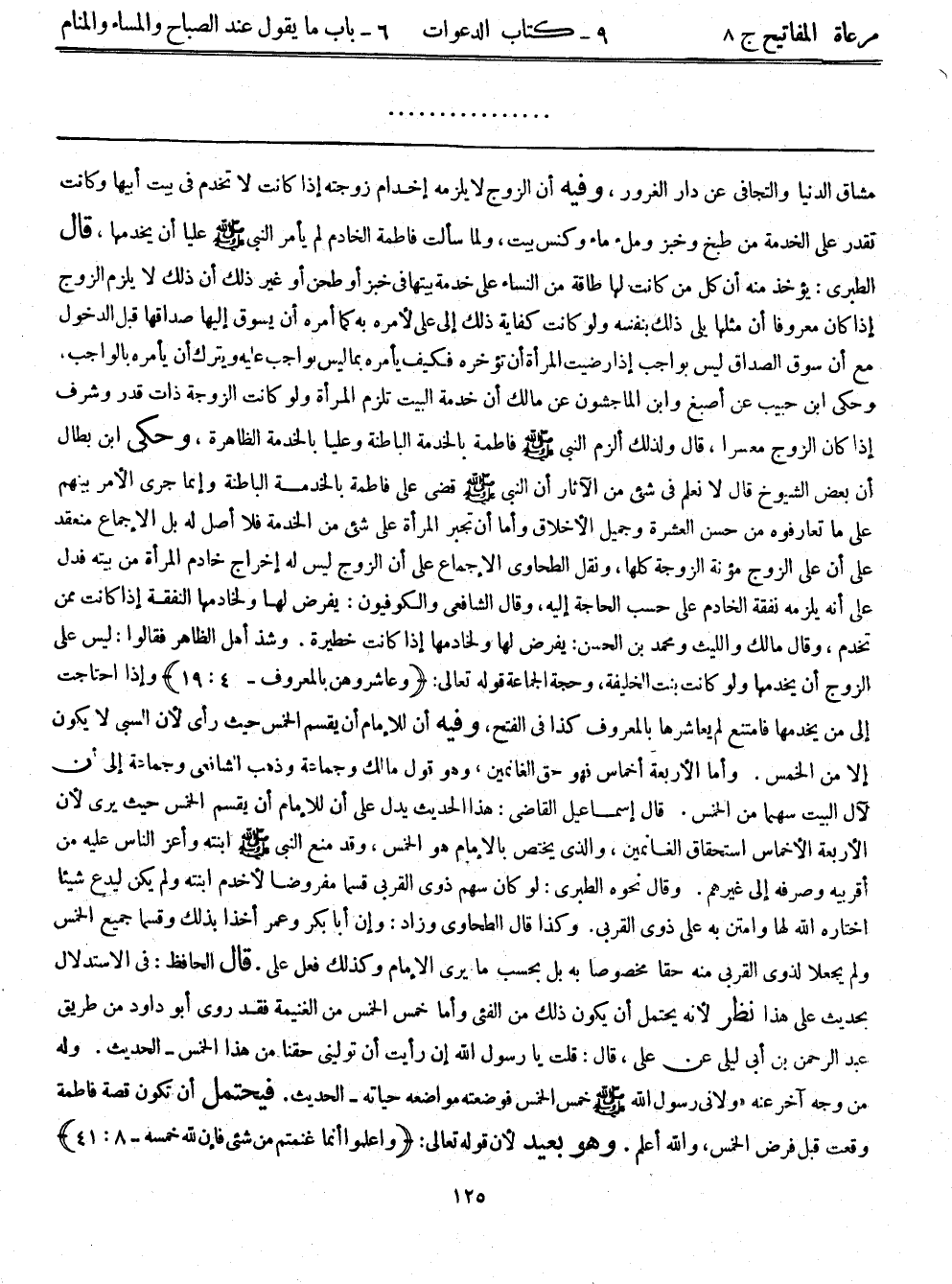 مشاق الدنيا والتجافي عن دار الغرور. وفيه أن الزوج لا يلزمه إخدام زوجته إذا كانت لا تخدم في بيت أبيها وكانت تقدر على الخدمة من طبخ وخبز وملء ماء وكنس بيت. ولما سألت فاطمة الخادم لم يأمر النبي - صلى الله عليه وسلم - عليًّا أن يخدمها. قال الطبري: يؤخذ منه أن كل من كانت لها طاقة من النساء على خدمة بيتها في خبز أو طحن أو غير ذلك أن ذلك لا يلزم الزوج إذا كان معروفًا أن مثلها يلي ذلك بنفسه ولو كانت كفاية ذلك إلى علي لأمره به كما أمره أن يسوق إليها صداقها قبل الدخول مع أن سوق الصداق ليس بواجب إذا رضيت المرأة أن تؤخره فكيف يأمره بما ليس بواجب عليه ويترك أن يأمره بالواجب. وحكى ابن حبيب عن أصبغ وابن الماجشون عن مالك أن خدمة البيت تلزم المرأة ولو كانت الزوجة ذات قدر وشرف إذا كان الزوج معسرًا. قال: ولذلك ألزم أن النبي - صلى الله عليه وسلم - فاطمة بالخدمة الباطنة وعليًّا بالخدمة الظاهرة. وحكى ابن بطال أن بعض الشيوخ قال: لا نعلم في شيء من الآثار أن النبي - صلى الله عليه وسلم - قضى على فاطمة بالخدمة الباطنة وإنما جرى الأمر بينهم على ما تعارفوه من حسن العشرة وجميل الأخلاق وأما أن تجبر المرأة على شيء من الخدمة فلا أصل له بل الإجماع منعقد على أن على الزوج مؤنة الزوجة كلها. ونقل الطحاوي الإجماع على أن الزوج ليس له إخراج خادم المرأة من بيته فدل على أنه يلزمه نفقة الخادم على حسب الحاجة إليه. وقال الشافعي والكوفيون: يفرض لها ولخادمها النفقة إذا كانت ممن تخدم. وقال مالك والليث ومحمد بن حسن: يفرض لها ولخادمها إذا كانت خطيرة. وشذ أهل الظاهر فقالوا: ليس على الزوج أن يخدمها ولو كانت بنت الخليفة، وحجة الجماعة قوله تعالى: {وَعَاشِرُوهُنَّ بِالْمَعْرُوفِ} (4: 19) وإذا احتاجت إلى من يخدمها فامتنع لم يعاشرها بالمعروف كذا في الفتح. وفيه أن للإمام أن يقسم الخمس حيث رأى لأن السبي لا يكون إلا من الخمس. وأما الأربعة أخماس فهو حق الغانمين، وهو قول مالك وجماعة. وذهب الشافعي جماعة إلى أن لآل البيت سهمًا من الخمس. قال إسماعيل القاضي: هذا الحديث يدل على أن للإمام أن يقسم الخمس حيث يرى. لأن الأربعة الأخماس استحقاق الغانمين، والذي يختص بالإمام هو الخمس، وقد منع النبي - صلى الله عليه وسلم - ابنته وأعز الناس عليه من أقربيه وصرفه إلى غيرهم. وقال نحوه الطبري: لو كان سهم ذوي القربى قسمًا مفروضًا لأخدم ابنته ولم يكن ليدع شيئًا اختاره الله ولها وامتن به على ذوي القربى. وكذا قال الطحاوي وزاد: وإن أبا بكر وعمر أخذا بذلك وقسما جميع الخمس ولم يجعلا لذوي القربى منه حقًا مخصوصًا به بل بحسب ما يرى الإمام وكذلك فعل علي. قال الحافظ: في الاستدلال بحديث علي هذا نظر لأنه يحتمل أن يكون ذلك من الفيء وأما خمس الخمس من الغنيمة فقد روى أبو داود من طريق عبد الرحمن بن أبي ليلى عن علي، قال: قلت: يا رسول الله إن رأيت أن توليني حقنًا من هذا الخمس - الحديث. وله من وجه آخر عنه ((ولاني رسول الله - صلى الله عليه وسلم - خمس الخمس فوضعته مواضعه حياته - الحديث. فيحتمل أن تكون قصة فاطمة وقعت قبل فرض الخمس. والله أعلم. وهو بعيد لأن قوله تعالى: {وَاعْلَمُواْ أَنَّمَا غَنِمْتُم مِّن شَيْءٍ فَأَنَّ لِلّهِ خُمُسَهُ} (8: 41) .