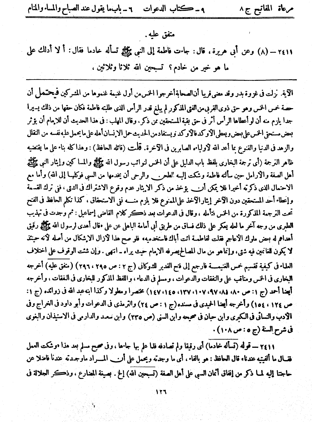 2411- (8) وعن أبي هريرة قال: جاءت فاطمة إلى النبي - صلى الله عليه وسلم - تَسْأَلُهُ خَادِمًا فَقَالَ: أَلا أَدُلُّكِ عَلَى مَا هُوَ خَيْرٌ مِنْ خَادِمٍ؟ تُسَبِّحِينَ الله ثَلَاثًا وَثَلَاثِينَ