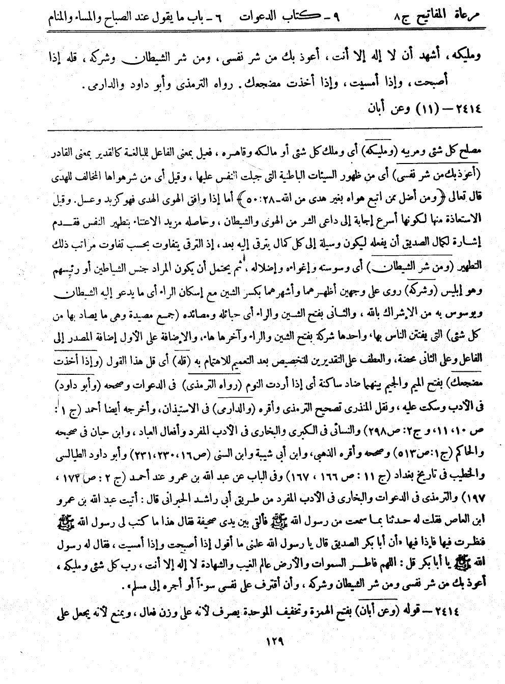 وَمَلِيكَهُ أَشْهَدُ أَنْ لا إِلَهَ إِلَّا أَنْتَ أَعُوذُ بِكَ مِنْ شَرِّ نَفْسِي وَمِنْ شَرِّ الشَّيْطَانِ وَشِرْكِهِ قُلْهُ إِذَا أَصْبَحْتَ وَإِذَا أَمْسَيْتَ وَإِذَا أَخَذْتَ مَضْجَعَكَ. رواه الترمذي، وأبو داود، والدارمي.