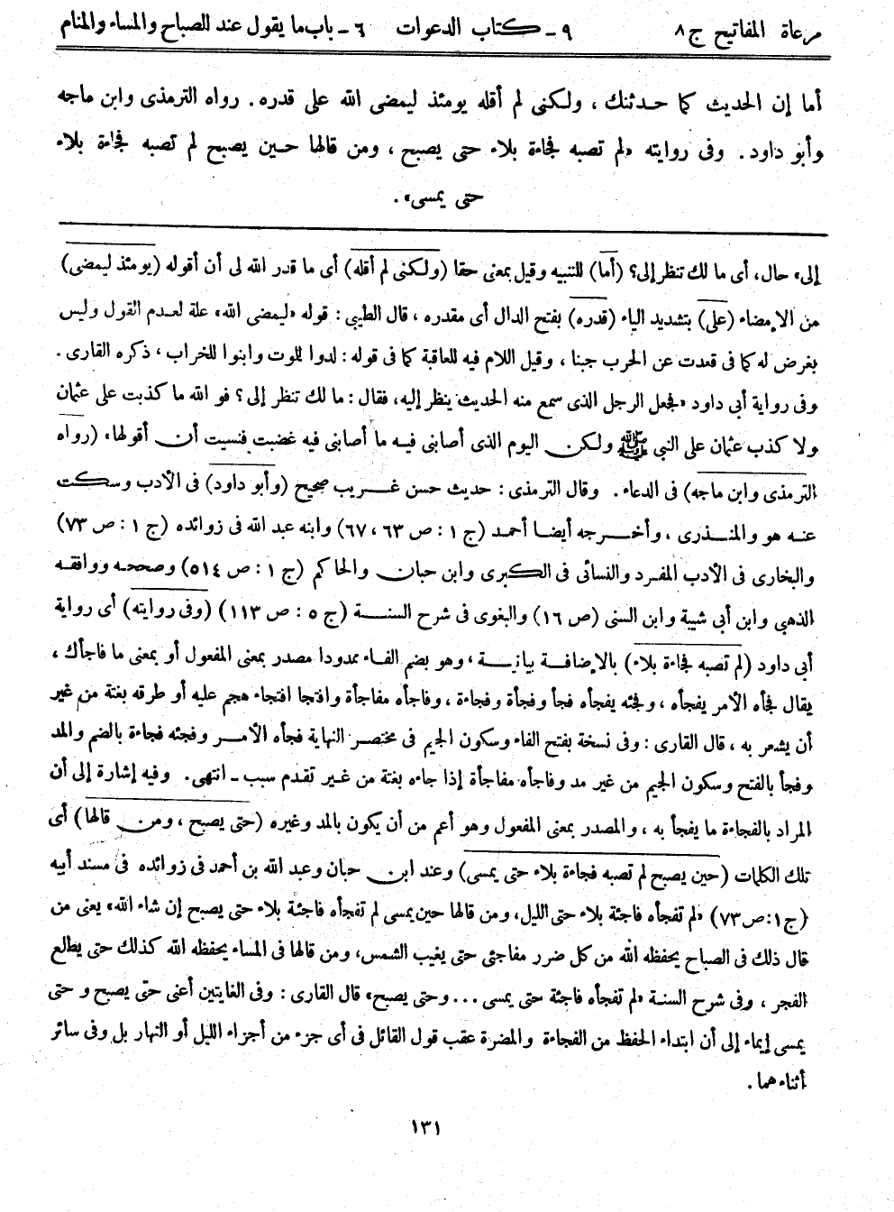 إليّ)) حال، أي: ما لك تنظر إلي؟ (أما) للتنبيه وقيل: بمعنى حقًا (ولكني لم أقله) أي: ما قدر الله لي أن أقوله (يومئذ ليمضي) من الإمضاء (عليّ) بتشديد الياء (قدره) بفتح الدال أي: مقدره. قال الطيبي: قوله: ((ليمضي الله)) علة لعدم القول وليس بغرض له كما في قعدت عن الحرب جبنًا، وقيل: اللام فيه للعاقبة. كما في قوله: لدوا للموت وابنوا للخراب، ذكره القاري. وفي رواية أبي داود ((فجعل الرجل الذي سمع منه الحديث ينظر إليه، فقال: ما لك تنظر إلي؟ فو الله ما كذبت على عثمان ولا كذب عثمان على النبي - صلى الله عليه وسلم - ولكن اليوم الذي أصابني فيه ما أصابني فيه غضبت فنسيت أن أقولها)) . (رواه الترمذي، وابن ماجة) في الدعاء. وقال الترمذي: حديث حسن غريب صحيح (وأبو داود) في الأدب، وسكت عنه هو والمنذري، وأخرجه أيضًا أحمد (ج1: ص63، 67) ، وابنه عبد الله في زوائده (ج1: ص73) ، والبخاري في الأدب المفرد، والنسائي في الكبرى، وابن حبان، والحاكم (ج1: ص514) وصححه ووافقه الذهبي، وابن أبي شيبة، وابن السني (ص16) ، والبغوي في شرح السنة (ج5: ص113) (وفي روايته) أي: رواية أبي داود (لم تصبه فجاءة بلاء) بالإضافة بيانية، وهو بضم الفاء ممدودًا مصدر بمعنى المفعول أو بمعنى ما فاجأك. يقال: فجأه الأمر يفجأه، وفجئه يفجأه فجأ، وفجأة وفجأءة، وفاجأه مفاجأة، وافتجأ افتجاء هجم عليه أو طرقه بغتة من غير أن يشعر به. قال القاري: وفي نسخة بفتح الفاء وسكون الجيم في مختصر النهاية فجأه الأمر وفجئه فجاءة بالضم والمد وفجأ بالفتح وسكون الجيم من غير مد وفاجأه مفاجأة إذا جاءه بغتة من غير تقدم سبب - انتهى. وفيه إشارة إلى أن المراد بالفجأءة ما يفجأ به، والمصدر بمعنى المفعول وهو أعم من أن يكون بالمد وغيره (حتى يصبح، ومن قالها) أي: تلك الكلمات (حين يصبح لم تصبه فجاءة بلاء حتى يمسي) وعند ابن حبان وعبد الله بن أحمد في زوائده في مسند أبيه (ج1: ص73) ((لم تفجأه فاجئة بلاء حتى الليل، ومن قالها حين يمسي لم تفجأه فاجئة بلاء حتى يصبح إن شاء الله)) يعني من قال ذلك في الصباح يحفظه الله من كل ضرر مفاجئ حتى يغيب الشمس، ومن قالها في المساء يحفظه الله كذلك حتى يطلع الفجر، وفي شرح السنة ((لم تفجأه فاجئة حتى يمسي ... وحتى يصبح)) . قال القاري: وفي الغايتين أعني حتى يصبح وحتى يمسي إيماء إلى أن ابتداء الحفظ من الفجاءة والمضرة عقب قول القائل في أي: جزأ من أجزاء الليل أو النهار بل وفي سائر أثناءهما.