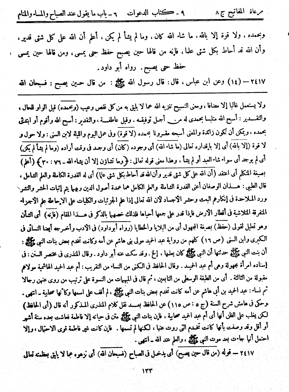 2417- (14) وعَنْ ابْنِ عَبَّاسٍ قال: قال رَسُول اللَّهِ - صلى الله عليه وسلم -: مَنْ قَالَ حِينَ يُصْبِحُ فَسُبْحَانَ اللَّهِ