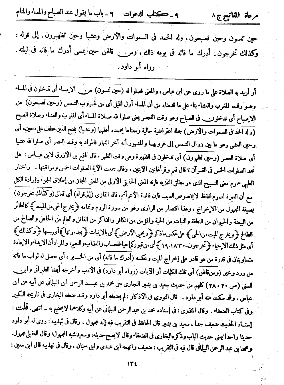 أو أريد به الصلاة على ما روي عن ابن عباس، والمعنى فصلوا له {حِينَ تُمْسُونَ} من الإمساء أي: تدخلون في المساء وهو وقت المغرب والعشاء بناء على ما قدمناه من أن المساء أول الليل أي من غروب الشمس {وَحِينَ تُصْبِحُونَ} من الإصباح أي: تدخلون في الصباح وهو وقت الفجر. يعني صلوا لله صلاة المساء. أي: المغرب والعشاء وصلاة الصبح {وَلَهُ الْحَمْدُ فِي السَّمَاوَاتِ وَالْأَرْضِ} جملة اعتراضية حالية ومعناها يحمده أهلهما {وَعَشِيّاً} بفتح العين عطف على ((حين)) أي: وحين العشي وهو ما بين زوال الشمس إلى غروبها والمشهور أنه آخر النهار فالمراد به وقت العصر أي: صلوا لله عشيًا. أي: صلاة العصر {وَحِينَ تُظْهِرُونَ} أي: تدخلون في الظهيرة وهي وقت الظهر. قال نافع بن الأزرق لابن عباس: هل تجد الصلوات الخمس في القرآن؟ قال: نعم. وقرأ هاتين الآيتين، وقال: جمعت الآية الصلوات الخمس ومواقيتها. واختار الطيبي عموم معنى التسبيح الذي هو مطلق التنزيه فإنه المعنى الحقيقي الأولى من المعنى المجاز من إطلاق الجزء وإرادة الكل مع أن العبرة لعموم اللفظ لا بخصوص السبب فإن فائدة الأعم أتم. قاله القاري (إلى قوله) أي: تعالى: {وَكَذَلِكَ تُخْرَجُونَ} بصيغة المجهول من الإخراج، وهذا اقتصار من الرواي وهو من سورة الروم وتمامه: {يُخْرِجُ الْحَيَّ مِنَ الْمَيِّتِ} كالطائر من البيضة، والحيوان من النطفة، والنبات من الحبة، والمؤمن من الكافر، والذاكر من الغافل، والعالم من الجاهل، والصالح من الطالح {وَيُخْرِجُ الْمَيِّتَ مِنَ الْحَيِّ} على عكس ما ذكر {وَيُحْيِي الأَرْضَ} أي: بالإنبات {بَعْدَ مَوْتِهَا} أي: يبسها {وَكَذَلِكَ} أي: مثل ذلك الإحياء {تُخْرَجُونَ} (30: 18، 19) أي: من قبوركم إحياء للحساب والعذاب والنعيم، والمراد أن الإبداء والإعادة متساويتان في قدرة من هو قادر على إخراج الميت وعكسه (أدرك ما فاته) أي: من الخير. أي حصل له ثواب ما فاته من ورد وخير (ومن قالهن) أي: تلك الكلمات أو الآيات (رواه أبو داود) في الأدب، وأخرجه أيضًا الطبراني، وابن السني (ص20، 28) كلهم من حديث سعيد بن بشير النجارى عن محمد بن عبد الرحمن ابن البيلماني عن أبيه عن ابن عباس، وقد سكت عنه أبو داود. قال النووي في الأذكار: لم يضعفه أبو داود وقد ضعفه البخاري في تاريخه الكبير، وفي كتاب الضعفاء. وقال المنذري: في إسناده محمد بن عبد الرحمن البيلماني عن أبيه وكلاهما لا يحتج به - انتهى. قلت: إسناد الحديث ضعيف جدًا. سعيد بن بشير قال الحافظ في التقريب فيه: إنه مجهول، وقال في تهذيبه: روى له أبو داود حديثًا واحدًا يعني حديث الباب وذكره البخاري في الضعفاء. وقال: لا يصح حديثه، وسعيد شبه المجهول. وقال العقيلي: مجهول ومحمد بن عبد الرحمن البيلماني قال فيه في التقريب: ضعيف واتهمه ابن عدي، وابن حبان، وقال في تهذيبه: قال ابن معين:
