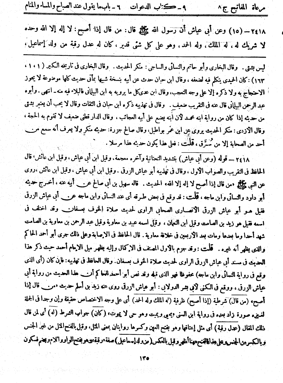 2418- (15) وعَنْ أَبِي عَيَّاشٍ أَنَّ رَسُولَ اللَّهِ - صلى الله عليه وسلم - قَالَ: مَنْ قَالَ إِذَا أَصْبَحَ لا إِلَهَ إِلا اللَّهُ وَحْدَهُ لا شَرِيكَ لَهُ لَهُ الْمُلْكُ وَلَهُ الْحَمْدُ وَهُوَ عَلَى كُلِّ شَيْءٍ قَدِيرٌ كَانَ لَهُ عِدْلَ رَقَبَةٍ مِنْ وَلَدِ إِسْمَعِيلَ