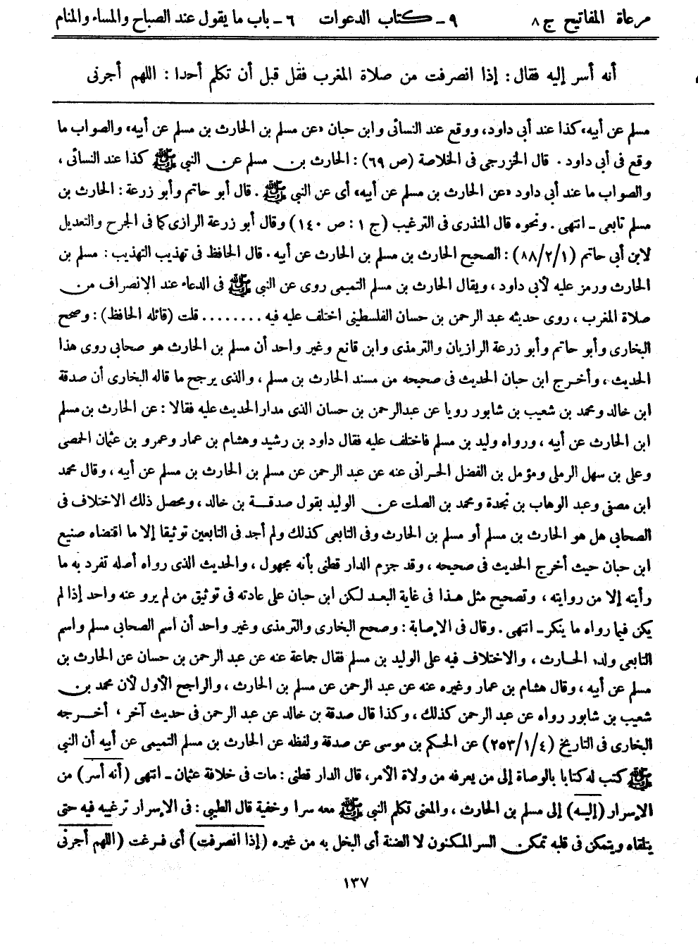 مسلم عن أبيه)) كذا عند أبي داود، ووقع عند النسائي، وابن حبان ((عن مسلم بن الحارث بن مسلم عن أبيه)) والصواب ما وقع في أبي داود. قال الخزرجي في الخلاصة (ص69) : الحارث بن مسلم عن النبي - صلى الله عليه وسلم - كذا عند النسائي، والصواب ما عند أبي داود ((عن الحارث بن مسلم عن أبيه)) أي: عن النبي - صلى الله عليه وسلم -. قال أبو حاتم، وأبو زرعة الرازي: الحارث بن مسلم تابعي - انتهى. ونحوه قال المنذري في الترغيب (ج1: ص140) وقال أبو زرعة الرازي كما في الجرح والتعديل لابن أبي حاتم (1/2/88) : الصحيح الحارث بن مسلم بن الحارث عن أبيه. قال الحافظ في تهذيب التهذيب: مسلم بن الحارث ورمز عليه لأبي داود، ويقال: الحارث بن مسلم التميمي روى عن النبي - صلى الله عليه وسلم - في الدعاء عند الانصراف من صلاة المغرب. روى حديثه عبد الرحمن بن حسان الفلسطيني اختلف عليه فيه....... قلت (قائله الحافظ) : وصحح البخاري، وأبو حاتم، وأبو زرعة الرازيان، والترمذي، وابن قانع وغير واحد أن مسلم بن الحارث هو: صحابي روى هذا الحديث. وأخرج ابن حبان الحديث في صحيحه من مسند الحارث بن مسلم، والذي يرجح ما قاله البخاري أن صدقة ابن خالد ومحمد بن شعيب بن شابور رويا عن عبد الرحمن بن حسان الذي مدار الحديث عليه فقالا: عن الحارث بن مسلم بن الحارث عن أبيه، ورواه وليد بن مسلم فاختلف عليه. فقال داود بن رشيد، وهشام بن عمار، وعمرو بن عثمان الحمصي، وعلي بن سهل الرملي، ومؤمل بن الفضل الحراني عنه عن عبد الرحمن عن مسلم بن الحارث بن مسلم عن أبيه. وقال محمد بن مصفى وعبد الوهاب بن نجدة، ومحمد بن الصلت عن الوليد بقول صدقة بن خالد، ومحصل ذلك الاختلاف في الصحابي هل هو الحارث بن مسلم أو مسلم بن الحارث وفي التابعي كذلك ولم أجد في التابعين توثيقًا إلا ما اقتضاه صنيع ابن حبان حيث أخرج الحديث في صحيحه، وقد جزم الدارقطني بأنه مجهول، والحديث الذي رواه أصله تفرد به ما رأيته إلا من روايته، وتصحيح مثل هذا في غاية البعد لكن ابن حبان على عادته في توثيق من لم يرو عنه واحد إذا لم يكن فيما رواه ما ينكر - انتهى. وقال في الإصابة: وصحح البخاري، والترمذي وغير واحد: أن اسم الصحابي مسلم واسم التابعي ولده الحارث، والاختلاف فيه على الوليد بن مسلم فقال جماعة: عنه عن عبد الرحمن بن حسان عن الحارث بن مسلم عن أبيه. وقال هشام بن عمار وغيره عنه عن عبد الرحمن عن مسلم بن الحارث. والراجح الأول لأن محمد بن شعيب بن شابور رواه عن عبد الرحمن كذلك. وكذا قال: صدقة بن خالد عن عبد الرحمن في حديث آخر، وأخرجه البخاري في التاريخ (4/1/253) عن الحكم بن موسى عن صدقة ولفظه عن الحارث بن مسلم التميمي عن أبيه أن النبي - صلى الله عليه وسلم - كتب له كتابًا بالوصاة إلى من يعرفه من ولاة الأمر، قال الدارقطني: مات في خلافة عثمان – انتهى. (أنه أسر) من الإسرار (إليه) إلى مسلم بن الحارث، والمعنى تكلم النبي - صلى الله عليه وسلم - معه سرًا وخفية. قال الطيبي: في الإسرار ترغيبه فيه حتى يتلقاه ويتمكن في قلبه تمكن السر المكنون لا الضنة. أي: البخل به من غيره (إذا انصرفت) أي: فرغت (اللهم أجرني