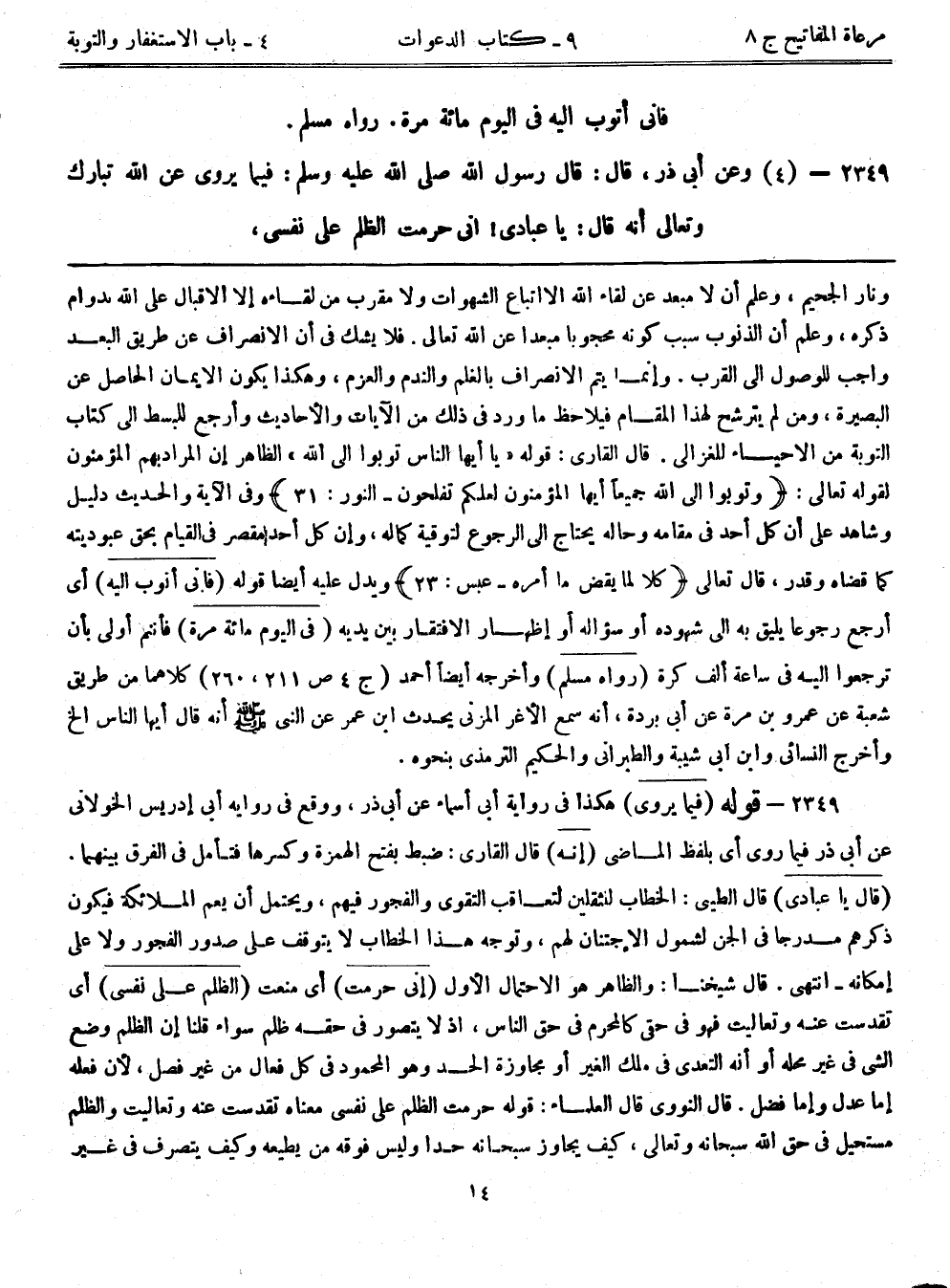 2349- (4) وعَنْ أَبِي ذَرٍّ قَالَ: قَالَ رَسُولُ اللَّهِ صَلَّى اللَّهُ عَلَيْهِ وَسَلَّمَ فِيمَا يَرْوِي عَنْ اللَّهِ تَبَارَكَ وَتَعَالَى أَنَّهُ قَالَ: يَا عِبَادِي إِنِّي حَرَّمْتُ الظُّلْمَ عَلَى نَفْسِي