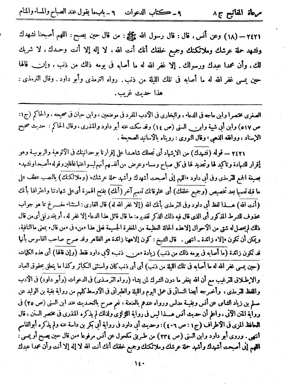 2421- (18) عَنْ أَنَسِ قَالَ: قَالَ رَسُولُ اللَّهِ صَلَّى اللَّهُ عَلَيْهِ وَسَلَّمَ مَنْ قَالَ حِينَ يُصْبِحُ اللَّهُمَّ أَصْبَحْنا نُشْهِدُكَ وَنُشْهِدُ حَمَلَةَ عَرْشِكَ وَمَلَائِكَتَكَ وَجَمِيعَ خَلْقِكَ أَنَّكَ أَنْتَ اللَّهُ لا إِلَهَ إِلا أَنْتَ وَحْدَكَ لا شَرِيكَ لَكَ وَأَنَّ مُحَمَّدًا عَبْدُكَ وَرَسُولُكَ إِلا غفرَ اللهُ له مَا أَصَابَه فِي يَوْمِهِ ذَلِكَ مِنْ ذَنْبٍ وَإِنْ قَالَهَا حِينَ يُمْسِي غفرَ الله لَهُ مَا أَصَابَ تِلْكَ اللَّيْلَةَ مِنْ ذَنْبٍ. رواه الترمذي وأبوداود وقال الترمذي: هَذَا حَدِيثٌ غَرِيبٌ.