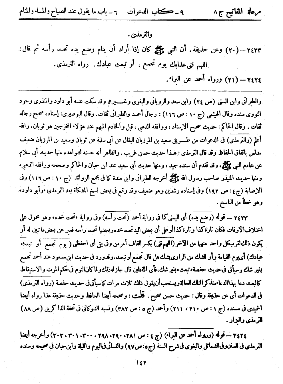 2423- (20) عَنْ حُذَيْفَةَ أَنَّ النَّبِيَّ - صلى الله عليه وسلم - كَانَ إِذَا أَرَادَ أَنْ يَنَامَ وَضَعَ يَدَهُ تَحْتَ رَأْسِهِ ثُمَّ قَالَ: اللَّهُمَّ قِنِي عَذَابَكَ يَوْمَ تَجْمَعُ أَوْ تَبْعَثُ عِبَادَكَ. رواه الترمذي.