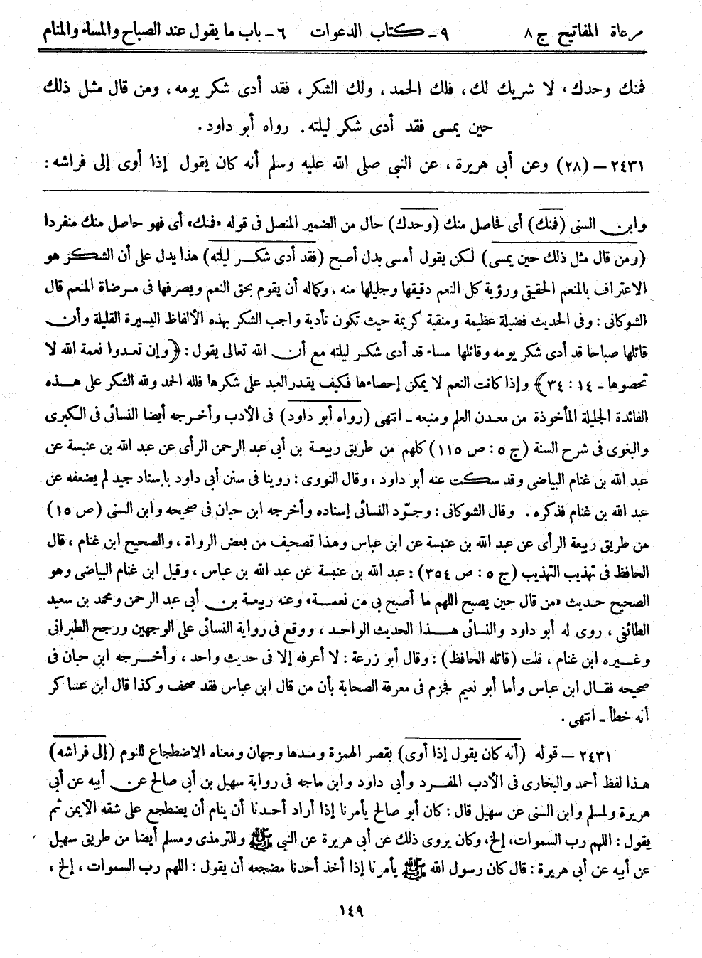 2431- قوله (أنه كان يقول إذا أوى) بقصر الهمزة ومدها وجهان ومعناه الاضطجاع للنوم (إلى فراشه) ، هذا لفظ أحمد، والبخاري في الأدب المفرد، وأبي داود وابن ماجة في رواية سهيل بن أبي صالح عن أبيه عن أبي هريرة، ولمسلم، وابن السني عن سهيل قال: كان أبو صالح يأمرنا إذا أراد أحدنا أن ينام أن يضطجع على شقه الأيمين، ثم يقول: اللهم رب السموات إلخ، وكان يروي ذلك عن أبي هريرة عن النبي - صلى الله عليه وسلم -، وللترمذي، ومسلم أيضًا من طريق سهيل عن أبيه عن أبي هريرة كان رسول الله - صلى الله عليه وسلم - يأمرنا إذا أخذ أحدنا مضجعه أن يقول: اللهم رب السموات، إلخ،