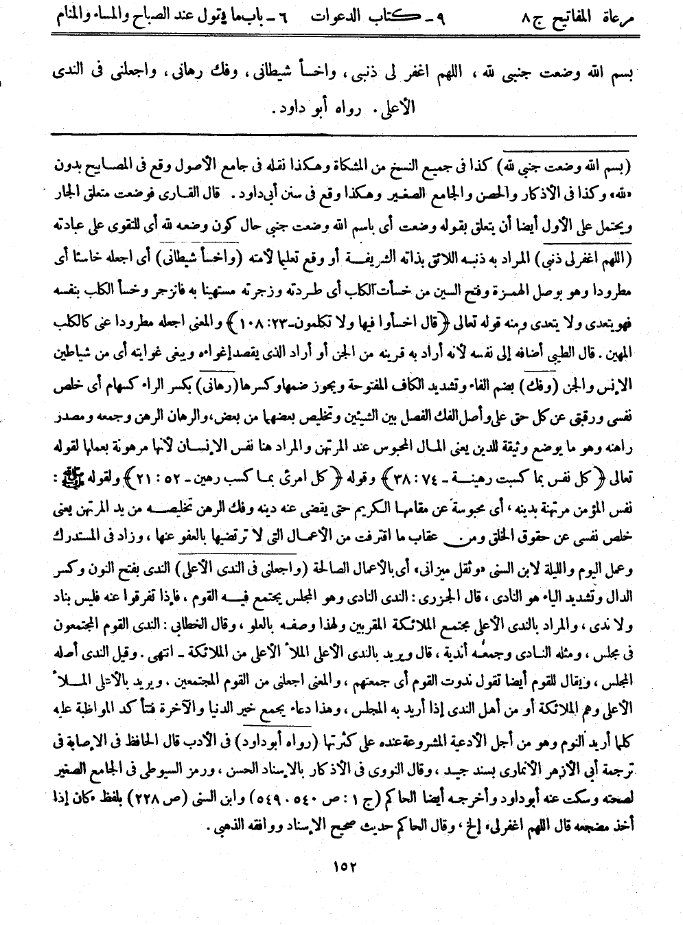 (بسم الله وضعت جنبي لله) كذا في جميع النسخ من المشكاة وهكذا نقله في جامع الأصول وقع في المصابيح بدون ((لله)) وكذا في الأذكار، والحصن، والجامع الصغير. وهكذا وقع في سنن أبي داود. قال القاري: فوضعت متعلق الجار ويحتمل على الأول أيضًا أن يتعلق بقوله: وضعت أي: باسم الله وضعت جنبي حال كون وضعه لله أي للتقوى على عبادته (اللهم اغفر لي ذنبي) المراد به ذنبه اللائق بذاته الشريفة أو وقع تعليمًا لأمته (واخسأ شيطاني) أي: اجعله خاسئًا أي: مطرودًا وهو بوصل الهمزة وفتح السين من خسأت الكلب أي: طردته وزجرته مستهينًا به فانزجر وخسأ الكلب بنفسه فهو يتعدى ولا يتعدى ومنه قوله تعالى: {قَالَ اخْسَؤُوا فِيهَا وَلَا تُكَلِّمُونِ} (23: 108) والمعنى اجعله مطرودًا عني كالكلب المهين. قال الطيبي: أضافه إلى نفسه لأنه أراد به قرينه من الجن أو أراد الذي يقصد إغواءه ويبغي غوايته أي من شياطين الإنس والجن (وفك) بضم الفاء وتشديد الكاف المفتوحة ويجوز ضمها وكسرها (رهاني) بكسر الراء كسهام أي خلص نفسي ورقبتي عن كل حق علي. وأصل الفك الفصل بين الشَّيْئَيّنِ وتخليص بعضهما من بعض. والرهان الرهن وجمعه ومصدر راهنه وهو ما يوضع وثيقة للدين يعني المال المحبوس عند المرتهن والمراد هنا نفس الإنسان لأنها مرهونة بعملها لقوله تعالى: {كُلُّ نَفْسٍ بِمَا كَسَبَتْ رَهِينَةٌ} (74: 38) وقوله: {كُلُّ امْرِئٍ بِمَا كَسَبَ رَهِينٌ} (52: 21) ولقوله - صلى الله عليه وسلم -: نفس المؤمن مرتهنة بدينه. أي محبوسة عن مقامها الكريم حتى يقضى عنه دينه. وفك الرهن تخليصه من يد المرتهن يعني خلص نفسي عن حقوق الخلق ومن عقاب ما اقترفت من الأعمال التي لا ترتضيها بالعفو عنها، وزاد في المستدرك وعمل اليوم والليلة لابن السني ((وثقل ميزاني)) أي بالأعمال الصالحة (واجعلني في النديّ الأعلى) النديّ: بفتح النون وكسر الدال وتشديد الياء هو النادي، قال الجزري: الندي النادي وهو المجلس يجتمع فيه القوم، فإذا تفرقوا عنه فليس بناد ولا ندي، والمراد بالندي الأعلى مجتمع الملائكة المقربين ولهذا وصفه بالعلو. وقال الخطابي: الندي القوم المجتمعون في مجلس، ومثله النادي وجمعه أندية، قال: ويريد بالندي الأعلى الملأ الأعلى من الملائكة - انتهى. وقيل: الندي أصله المجلس، ويقال للقوم أيضًا تقول: ندوت القوم أي جمعتهم، والمعنى اجعلني من القوم المجتمعين. ويريد بالأعلى الملأ الأعلى. وهم الملائكة أو من أهل الندي إذا أريد به المجلس، وهذا دعاء يجمع خير الدنيا والآخرة فتتأكد المواظبة عليه كلما أريد النوم وهو من أجل الأدعية المشروعة عنده على كثرتها (رواه أبو داود) في الأدب قال الحافظ في الإصابة في ترجمة أبي الأزهر الأنماري: بسند جيد. وقال النووي في الأذكار: بالإسناد الحسن، ورمز السيوطي في الجامع الصغير لصحته وسكت عنه أبو داود، وأخرجه أيضًا الحاكم (ج1: ص540، 549) ، وابن السنى (ص228) بلفظ ((كان إذا أخذ مضجعه قال: اللهم اغفر لي)) . إلخ، وقال الحاكم: حديث صحيح الإسناد ووافقه الذهبي.