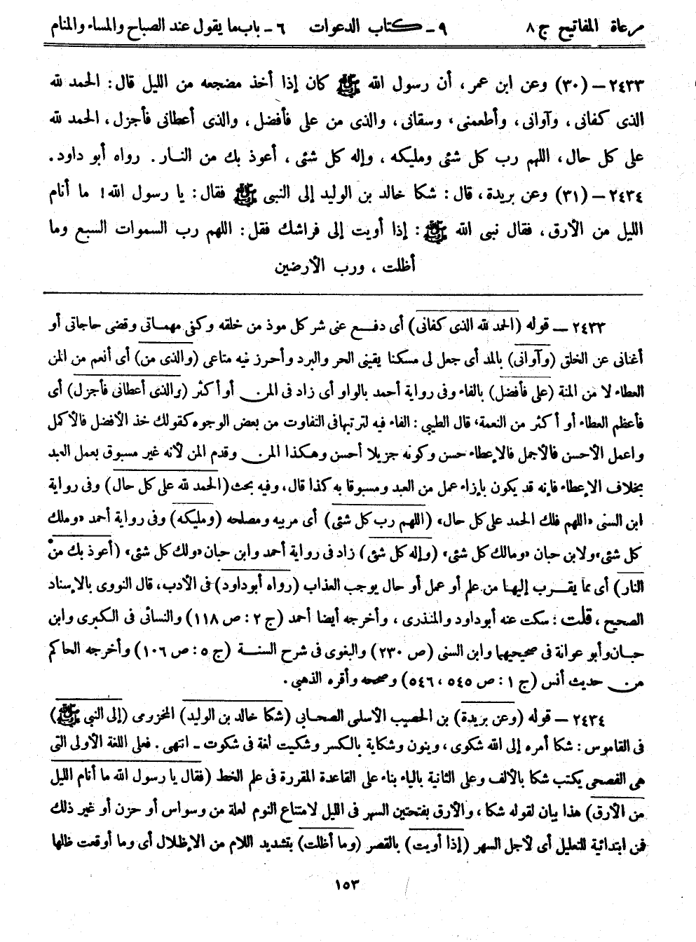 2433- (30) وعَنْ ابْنِ عُمَرَ أَنَّ رَسُولَ اللَّهِ - صلى الله عليه وسلم - كَانَ إِذَا أَخَذَ مَضْجَعَهُ من الليل قال: الْحَمْدُ لِلَّهِ الَّذِي كَفَانِي وَآوَانِي وَأَطْعَمَنِي وَسَقَانِي وَالَّذِي مَنَّ عَلَيَّ فَأَفْضَلَ وَالَّذِي أَعْطَانِي فَأَجْزَلَ الْحَمْدُ لِلَّهِ عَلَى كُلِّ حَالٍ اللَّهُمَّ رَبَّ كُلِّ شَيْءٍ وَمَلِيكَهُ وَإِلَهَ كُلِّ شَيْءٍ أَعُوذُ بِكَ مِنْ النَّارِ. رواه أبو داود.