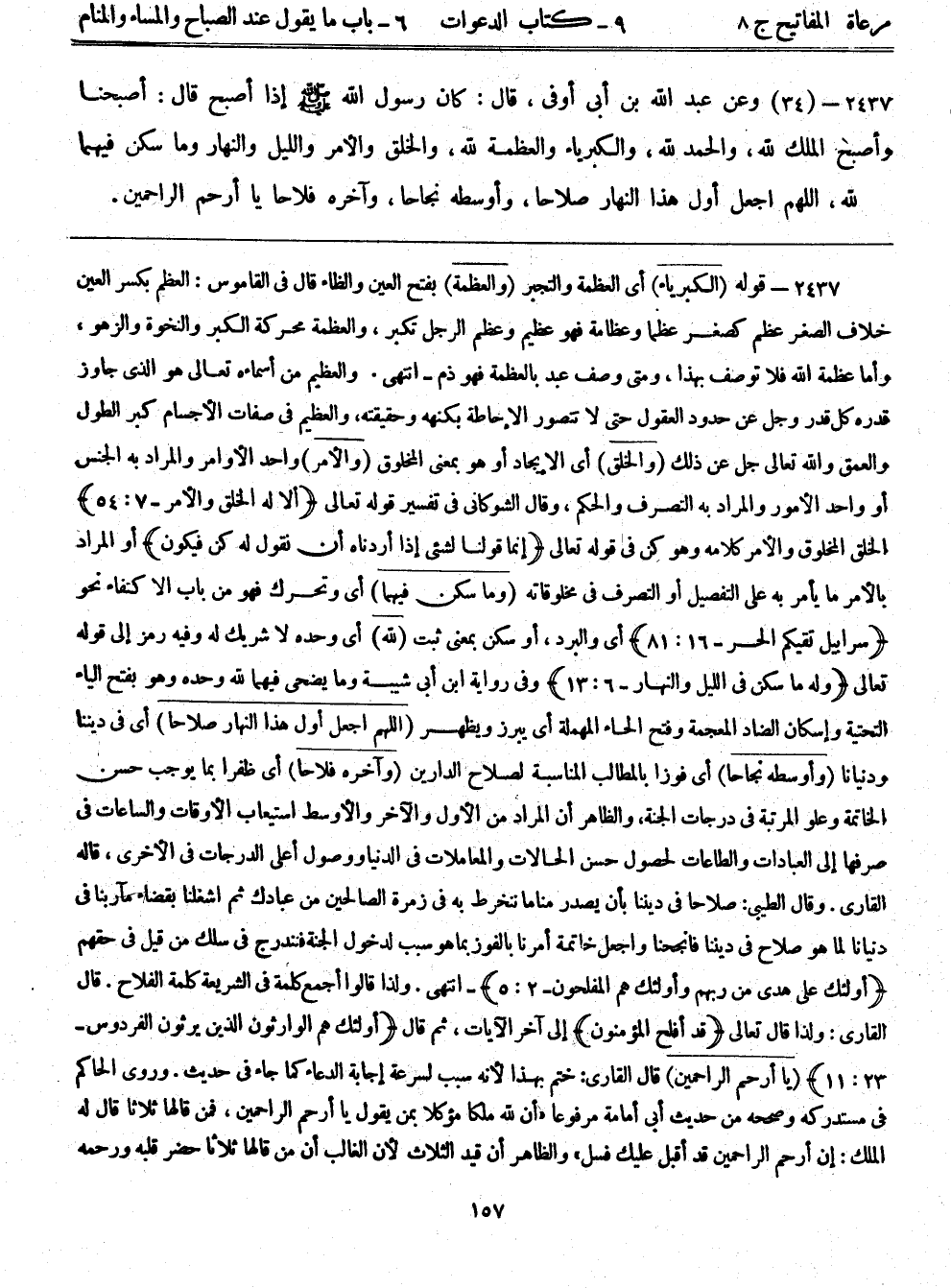 2437- (34) وعن عبد الله بن أبي أوفى قال: كان رسول الله - صلى الله عليه وسلم - إذا أصبح قال: أصبحنا وأصبح الملك لله، والحمد لله، والكبرياء والعظمة لله، والخلق والأمر والليل والنهار وما سكن فيهما لله، اللهم اجعل أول هذا النهار صلاحًا وأوسطه نجاحاً وآخره فلاحًا يا أرحم الراحمين.