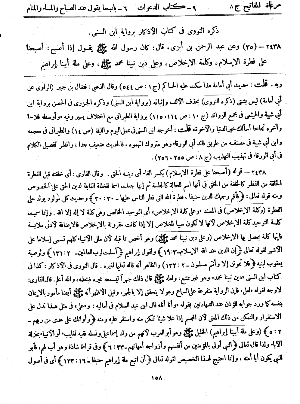 3438- (35) وعَبْدِ الرَّحْمَنِ بْنِ أَبْزَى قَالَ: كَانَ رَسُولُ اللَّهِ - صلى الله عليه وسلم - يقول إِذَا أَصْبَحَ: أَصْبَحْنَا عَلَى فِطْرَةِ الإِسْلَامِ وَكَلِمَةِ الإِخْلَاصِ وَعلى دِينِ نَبِيِّنَا مُحَمَّدٍ - صلى الله عليه وسلم - وَعلى مِلَّةِ أَبِينَا إِبْرَاهِيمَ