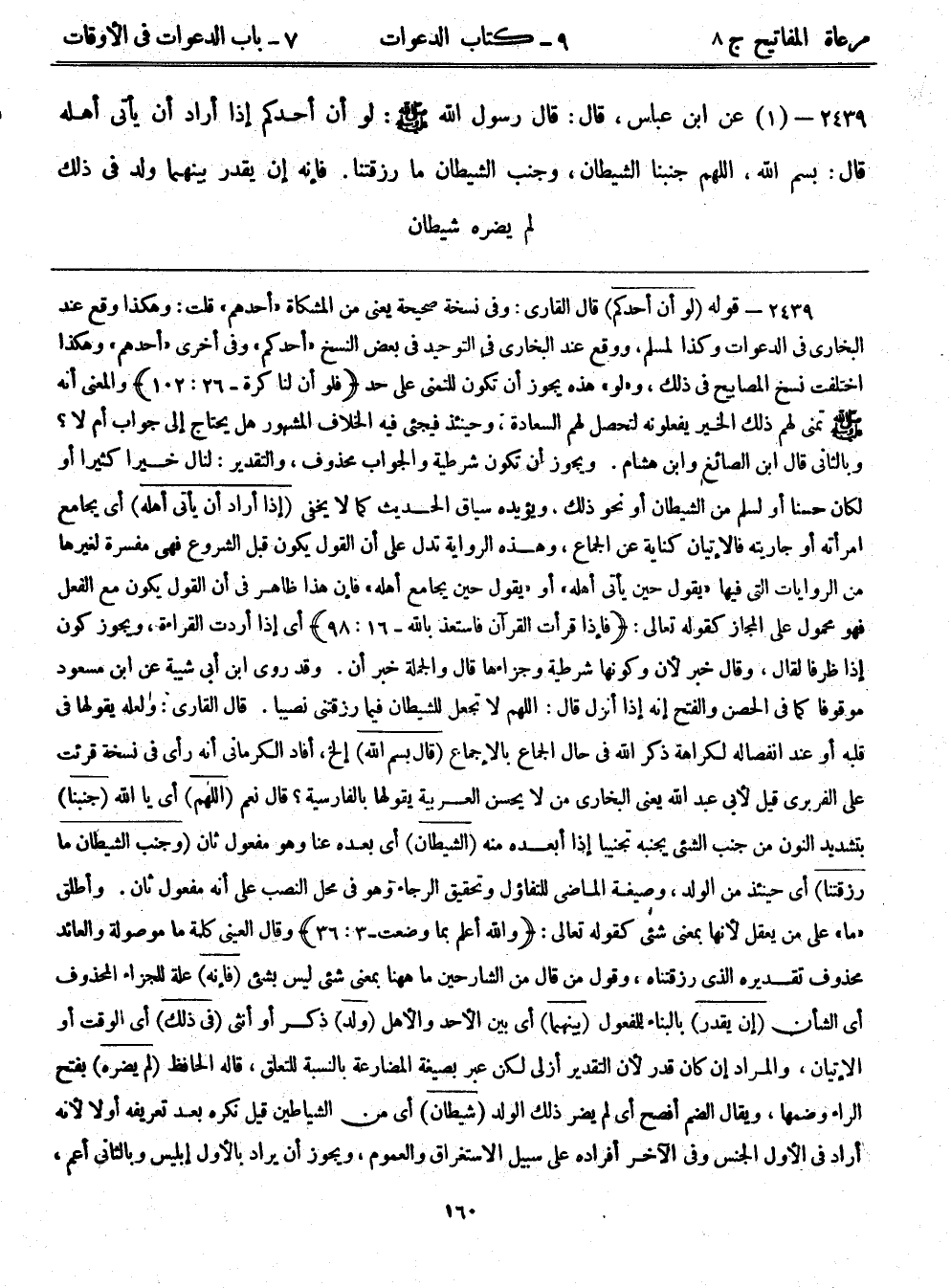 2439- (1) عَنْ ابْنِ عَبَّاسٍ قَالَ: قَالَ رَسُولُ اللَّهِ صَلَّى اللَّهُ عَلَيْهِ وَسَلَّمَ: لَوْ أَنَّ أَحَدَكُمْ إِذَا أَرَادَ أَنْ يَأْتِيَ أَهْلَهُ قَالَ بِاسْمِ اللَّهِ اللَّهُمَّ جَنِّبْنَا الشَّيْطَانَ وَجَنِّبْ الشَّيْطَانَ مَا رَزَقْتَنَا فَإِنَّهُ إِنْ يُقَدَّرْ بَيْنَهُمَا وَلَدٌ فِي ذَلِكَ لَمْ يَضُرَّهُ شَيْطَانٌ.