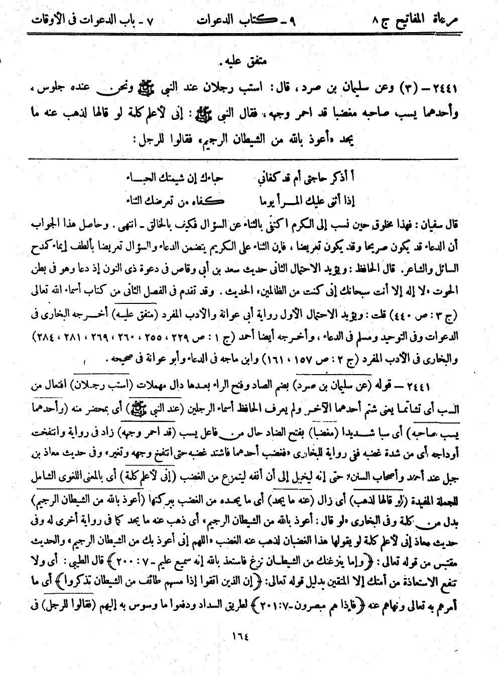 2441- (3) وعَنْ سُلَيْمَانَ بْنُ صُرَدٍ قَالَ: اسْتَبَّ رَجُلانِ عِنْدَ النَّبِيِّ - صلى الله عليه وسلم - وَنَحْنُ عِنْدَهُ جُلُوسٌ وَأَحَدُهُمَا يَسُبُّ صَاحِبَهُ مُغْضَبًا قَدْ احْمَرَّ وَجْهُهُ فَقَالَ النَّبِيُّ - صلى الله عليه وسلم -: إِنِّي لأَعْلَمُ كَلِمَةً لَوْ قَالَهَا لَذَهَبَ عَنْهُ مَا يَجِدُ ((أَعُوذُ بِاللَّهِ مِنْ الشَّيْطَانِ الرَّجِيمِ)) فَقَالُوا لِلرَّجُلِ: