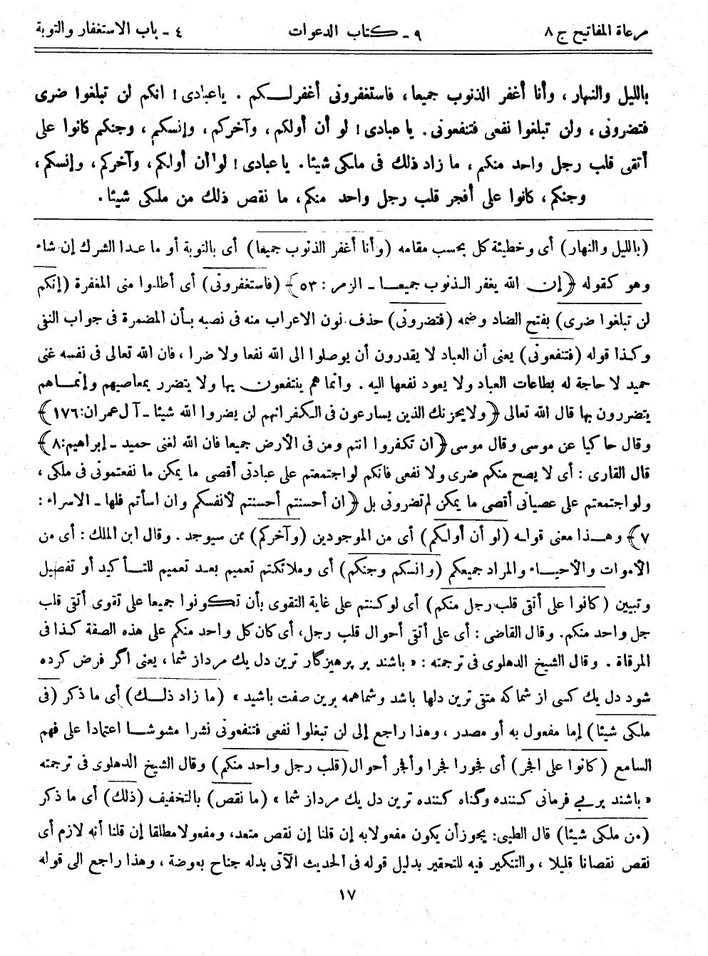 بِاللَّيْلِ وَالنَّهَارِ وَأَنَا أَغْفِرُ الذُّنُوبَ جَمِيعًا فَاسْتَغْفِرُونِي أَغْفِرْ لَكُمْ. يَا عِبَادِي إِنَّكُمْ لَنْ تَبْلُغُوا ضَرِّي فَتَضُرُّونِي، وَلَنْ تَبْلُغُوا نَفْعِي فَتَنْفَعُونِي. يَا عِبَادِي لَوْ أَنَّ أَوَّلَكُمْ وَآخِرَكُمْ وَإِنْسَكُمْ وَجِنَّكُمْ كَانُوا عَلَى أَتْقَى قَلْبِ رَجُلٍ وَاحِدٍ مِنْكُمْ مَا زَادَ ذَلِكَ فِي مُلْكِي شَيْئًا. يَا عِبَادِي لَوْ أَنَّ أَوَّلَكُمْ وَآخِرَكُمْ وَإِنْسَكُمْ وَجِنَّكُمْ كَانُوا عَلَى أَفْجَرِ قَلْبِ رَجُلٍ وَاحِدٍ مِنْكُمْ مَا نَقَصَ ذَلِكَ مِنْ مُلْكِي شَيْئًا.