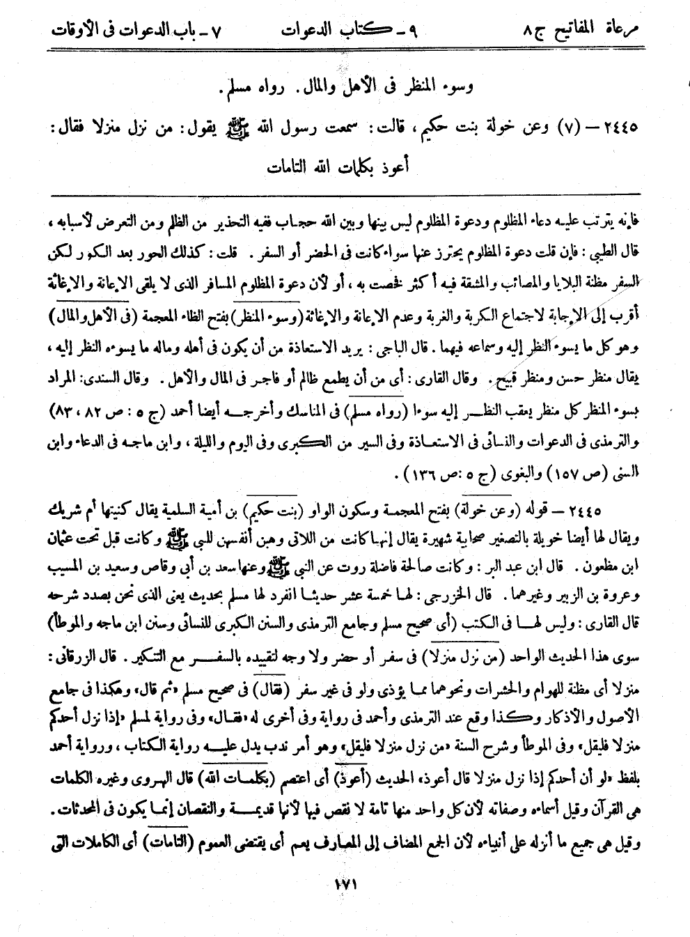 2445- قوله: (وعن خولة) بفتح المعجمة وسكون الواو (بنت حكيم) بن أمية السلمية يقال: كنيتها أم شريك ويقال لها أيضًا: خويلة بالتصغير صحابية شهيرة. يقال: إنها كانت من اللاتي وهبن أنفسهن للنبي - صلى الله عليه وسلم - وكانت قبل تحت عثمان ابن مظعون. قال ابن عبد البر: وكانت صالحة فاضلة روت عن النبي - صلى الله عليه وسلم -، وعنها سعد بن أبي وقاص، وسعيد بن المسيب، وعروة بن الزبير وغيرهما. قال الخزرجي: لها خمسة عشر حديثًا انفرد لها مسلم بحديث. يعني الذي نحن بصدد شرحه. قال القاري: وليس لها في الكتب (أي صحيح مسلم، وجامع الترمذي، والسنن الكبرى للنسائي، وسنن ابن ماجة، والموطأ) سوى هذا الحديث الواحد (من نزل منزلاً) في سفر أو حضر ولا وجه لتقييده بالسفر مع التنكير. قال الزرقاني: منزلاً أي مظنة للهوام والحشرات ونحوهما مما يؤذي ولو في غير سفر (فقال) في صحيح مسلم: ((ثم قال)) وهكذا في جامع الأصول والأذكار وكذا وقع عند الترمذي وأحمد في رواية وفي أخرى له ((فقال)) وفي رواية لمسلم ((إذا نزل أحدكم منزلاً فليقل)) وفي الموطأ وشرح السنة ((من نزل منزلاً فليقل)) وهو أمر ندب يدل عليه رواية الكتاب، ورواية أحمد بلفظ ((لو أن أحدكم إذا نزل منزلاً قال: أعوذ)) الحديث. (أعوذ) أي أعتصم (بكلمات الله) قال الهروي وغيره: الكلمات هي القرآن وقيل أسماءه وصفاته لأن كل واحد منها تامة لا نقص فيها لأنها قديمة والنقصان إنما يكون في المحدثات. وقيل هي جميع ما أنزله على أنبياءه لأن الجمع المضاف إلى المعارف يعم أي يقتضي العموم (التامات) أي الكاملات التي