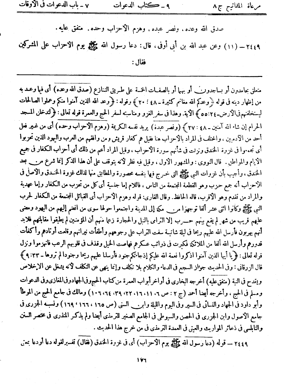 2449- (11) وعن عَبْدَ اللَّهِ بْنَ أَبِي أَوْفَى قال: دَعَا رَسُولُ اللَّهِ - صلى الله عليه وسلم - يَوْمَ الْأَحْزَابِ عَلَى الْمُشْرِكِينَ فَقَالَ:
