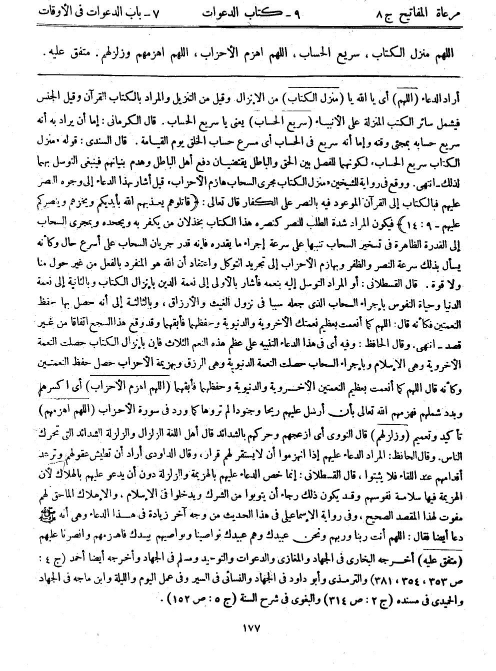 أراد الدعاء (اللهم) ، أي يا الله يا (منزل الكتاب) من الإنزال. وقيل: من التنزيل والمراد بالكتاب القرآن. وقيل: الجنس فيشمل سائر الكتب المنزلة على الأنبياء (سريع الحساب) يعني يا سريع الحساب. قال الكرماني: إما أن يراد به أنه سريع حسابه بمجئي وقته، وإما أنه سريع في الحساب أي مسرع حساب الخلق يوم القيامة. قال السندي: قوله: ((منزل الكتاب سريع الحساب)) لكونهما للفصل بين الحق والباطل يقتضيان دفع أهل الباطل وهدم بنيانهم، فينبغي التوسل بهما لذلك - انتهى. ووقع في رواية للشيخين ((منزل الكتاب مجري السحاب هازم الأحزاب)) قيل أشار بهذا الدعاء إلى وجوه النصر عليهم فبالكتاب إلى القرآن الموعود فيه بالنصر على الكفار قال تعالى: {قَاتِلُوهُمْ يُعَذِّبْهُمُ اللهُ بِأَيْدِيكُمْ وَيُخْزِهِمْ وَيَنصُرْكُمْ عَلَيْهِمْ} (9: 14) فيكون المراد شدة الطلب للنصر كنصره هذا الكتاب بخذلان من يكفر به ويجحده وبمجري السحاب إلى القدرة الظاهرة في تسخير السحاب تنبيهًا على سرعة إجراء ما يقدره فإنه قدر جريان السحاب على أسرع حال وكأنه يسأل بذلك سرعة النصر والظفر. وبهازم الأحزاب إلى تجريد التوكل واعتقاد أن الله هو المنفرد بالفعل من غير حول منا ولا قوة. قال القسطلاني: أو المراد التوسل إليه بنعمة فأشار بالأولى إلى نعمة الدين بإنزال الكتاب وبالثانية إلى نعمة الدنيا وحياة النفوس بإجراء السحاب الذي جعله سببًا في نزول الغيث والأرزاق، وبالثالثة إلى أنه حصل بها حفظ النعمتين فكأنه قال: اللهم كما أنعمت بعظيم نعمتك الأخروية والدنيوية وحفظهما فأبقهما وقد وقع هذا السجع اتفاقًا من غير قصد - انتهى. وقال الحافظ: وفيه أي في الدعاء التنبيه على عظم هذه النعم الثلاث فإن بإنزال الكتاب حصلت النعمة الأخروية وهي الإسلام وبإجراء السحاب حصلت النعمة الدنيوية وهي الرزق وبهزيمة الأحزاب حصل حفظ النعمتين وكأنه قال: اللهم كما أنعمت بعظيم النعمتين الأخروية والدنيوية وحفظهما فأبقهما (اللهم اهزم الأحزاب) ، أي اكسرهم وبدد شملهم فهزمهم الله تعالى بأن أرسل عليهم ريحًا وجنودًا لم تروها كما في سورة الأحزاب (اللهم اهزمهم) تأكيد وتعميم (وزلزلهم) قال النووي، أي أزعجهم وحركهم بالشدائد قال أهل اللغة الزلزال والزلزلة الشدائد التي تحرك الناس. وقال الحافظ: المراد الدعاء عليهم إذا انهزموا أن لا يستقر لهم قرار، وقال الداودي أراد أن تطيش عقولهم وترعد أقدامهم عند اللقاء فلا يثبتوا. قال القسطلاني: إنما خص الدعاء عليهم بالهزيمة والزلزلة دون أن يدعو عليهم بالهلاك لأن الهزيمة فيها سلامة نفوسهم وقد يكون ذلك رجاء أن يتوبوا من الشرك ويدخلوا في الإسلام، والإهلاك الماحق لهم مفوت لهذا المقصد الصحيح. وفي رواية الإسماعيلي في هذا الحديث من وجه آخر زيادة في هذا الدعاء وهي أنه - صلى الله عليه وسلم - دعا أيضًا فقال: اللهم أنت ربنا وربهم ونحن عبيدك وهم عبيدك نواصينا ونواصيهم بيدك فاهزمهم وانصرنا عليهم. (متفق عليه) أخرجه البخاري في الجهاد، والمغازي، والدعوات، والتوحيد، ومسلم في الجهاد، وأخرجه أيضًا أحمد (ج4: ص353، 354، 381) ، والترمذي، وأبو داود في الجهاد، والنسائي في السير، وفي عمل اليوم والليلة، وابن ماجه في الجهاد، والحميدي في مسنده (ج2: ص314) والبغوي في شرح السنة (ج5: ص152) .