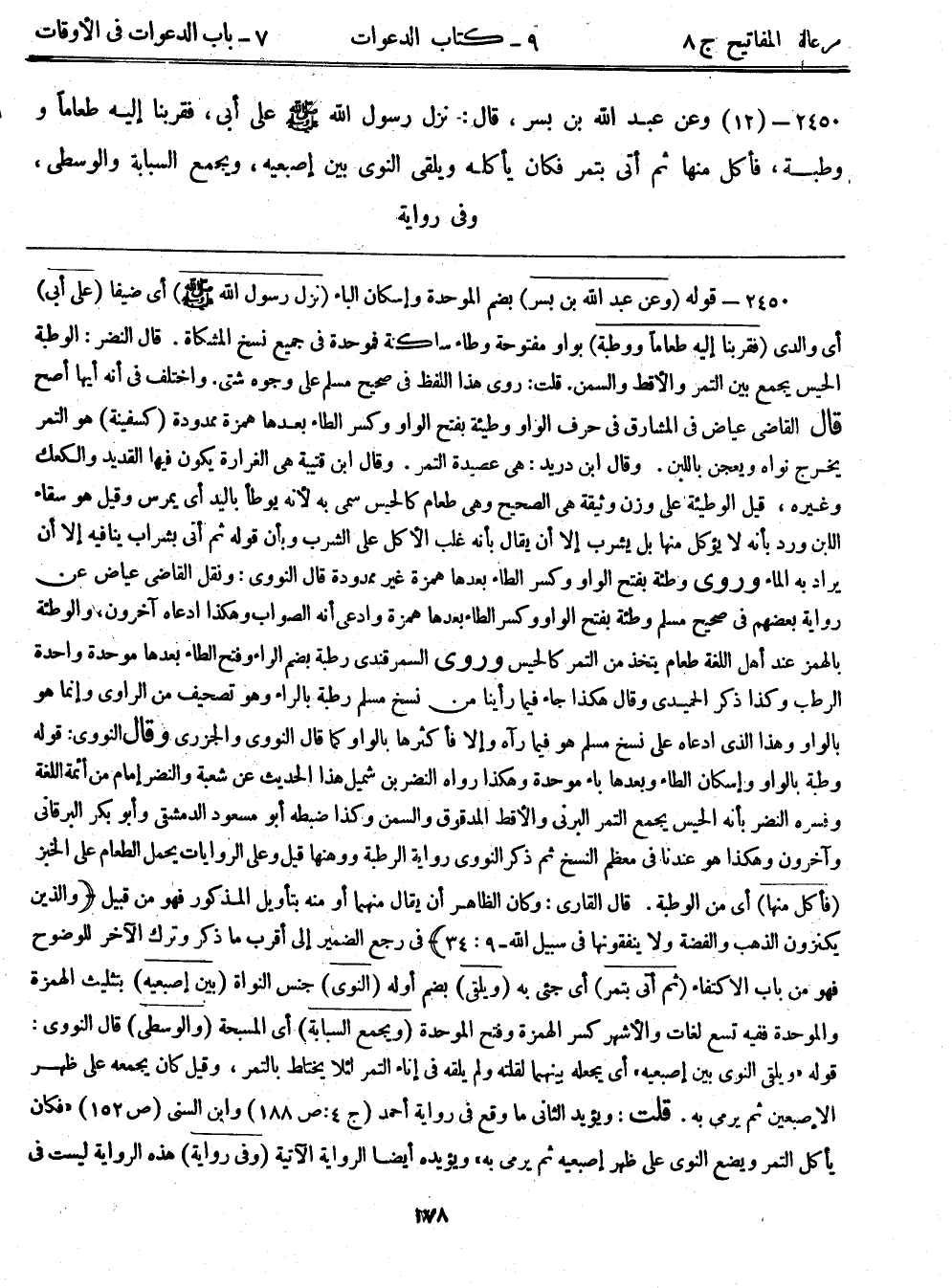 2450- قوله (وعن عبد الله بن بسر) بضم الموحدة وإسكان الباء (نزل رسول الله - صلى الله عليه وسلم -) ، أي ضيفًا (على أبي) ، أي والدي (فقربنا إليه طعامًا ووطبة) بواو مفتوحة وطاء ساكنة فموحدة في جميع نسخ المشكاة. قال النضر: الوطبة الحيس يجمع بين التمر والأقط والسمن. قلت: روي هذا اللفظ في صحيح مسلم على وجوه شتى. واختلف في أنه أيها أصح. قال القاضي عياض: في المشارق في حرف الواو: وطيئة بفتح الواو وكسر الطاء بعدها همزة ممدودة (كسفينة) هو التمر يخرج نواه ويعجن باللبن. وقال ابن دريد: هي عصيدة التمر. وقال ابن قتتيبة: هي الغرارة يكون فيها القديد والكعك وغيره. قيل: الوطيئة على وزن وثيقة هي الصحيح وهي طعام كالحيس سمي به لأنه يوطأ باليد أي يمرس وقيل هو سقاء اللبن ورد بأنه لا يؤكل منها بل يشرب إلا أن يقال بأنه غلب الأكل على الشرب وبأن قوله ثم أتي بشراب ينافيه إلا أن يراد به الماء. وروي وطئة بفتح الواو وكسر الطاء بعدها همزة غير ممدودة قال النووي: ونقل القاضي عياض عن رواية بعضهم في صحيح مسلم وطئة بفتح الواو وكسر الطاء بعدها همزة وادعى أنه الصواب وهكذا ادعاه آخرون. والوطئة بالهمزة عند أهل اللغة طعام يتخذ من التمر كالحيس. وروى السمرقندي رطبة بضم الراء وفتح الطاء بعدها موحدة واحدة الرطب وكذا ذكر الحميدي. وقال هكذا جاء فيما رأينا من نسخ مسلم رطبة بالراء وهو تصحيف من الراوي وإنما هو بالواو، وهذا الذي ادعاه على نسخ مسلم هو فيما رآه وإلا فأكثرها بالواو وكما قال النووي والجزري. وقال النووي: قوله: وطبة بالواو وإسكان الطاء وبعدها باء موحدة وهكذا رواه النضر بن شميل هذا الحديث عن شعبة والنضر إمام من أئمة اللغة وفسره النضر بأنه الحيس يجمع التمر البرني والأقط المدقوق والسمن. وكذا ضبطه أبو مسعود الدمشقي وأبو بكر البرقاني وآخرون وهكذا هو عندنا في معظم النسخ ثم ذكر النووي رواية الرطبة ووهنها قيل وعلى الروايات يحمل الطعام على الخبز (فأكل منها) أي من الوطبة. قال القاري: وكان الظاهر أن يقال منهما أو منه بتأويل المذكور فهو من قبيل {وَالَّذِينَ يَكْنِزُونَ الذَّهَبَ وَالْفِضَّةَ وَلاَ يُنفِقُونَهَا فِي سَبِيلِ اللهِ} (9: 34) في رجع الضمير إلى أقرب ما ذكر وترك الآخر للوضوح فهو من باب الاكتفاء (ثم أتي بتمر) أي جئي به (ويلقي) بضم أوله (النوى) جنس النواة (بين إصبعيه) بتثليث الهمزة والموحدة ففيه تسع لغات والأشهر كسر الهمزة وفتح الموحدة (ويجمع السبابة) أي المسبحة (والوسطى) قال النووي: قوله ((ويلقي النوى بين إصبعيه)) ، أي يجعله بينهما لقلته ولم يلقه في إناء التمر لئلا يختلط بالتمر. وقيل كان يجمعه على ظهر الإصبعين ثم يرمي به. قلت: ويؤيد الثاني ما وقع في رواية أحمد (ج4: ص188) ، وابن السني (ص152) ((فكان يأكل التمر ويضع النوى على ظهر إصبعيه، ثم يرمي به)) ويؤيده أيضًا الروية الآتية (وفي رواية) هذه الرواية ليست في