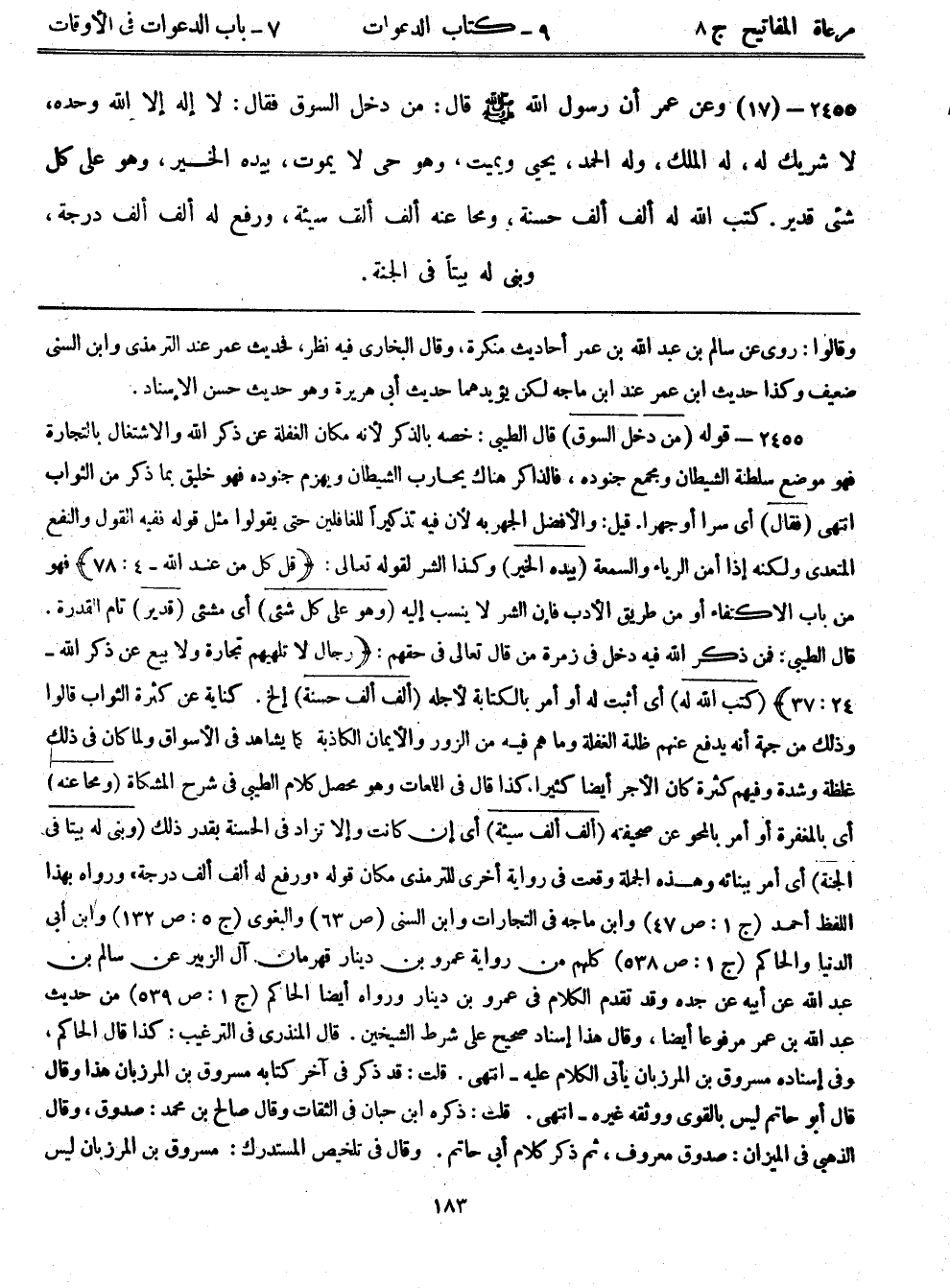 2455- (17) وعن ابْنِ عُمَرَ أَنَّ رَسُولَ اللَّهِ - صلى الله عليه وسلم - قَالَ: مَنْ دَخَلَ السُّوقَ فَقَالَ: لا إِلَهَ إِلا اللَّهُ وَحْدَهُ لا شَرِيكَ لَهُ لَهُ الْمُلْكُ وَلَهُ الْحَمْدُ يُحْيِي وَيُمِيتُ وَهُوَ حَيٌّ لا يَمُوتُ بِيَدِهِ الْخَيْرُ وَهُوَ عَلَى كُلِّ شَيْءٍ قَدِيرٌ كَتَبَ اللَّهُ لَهُ أَلْفَ أَلْفِ حَسَنَةٍ وَمَحَا عَنْهُ أَلْفَ أَلْفِ سَيِّئَةٍ وَرَفَعَ لَهُ أَلْفَ أَلْفِ دَرَجَةٍ وَبَنَى لَهُ بَيْتًا فِي الْجَنَّةِ.