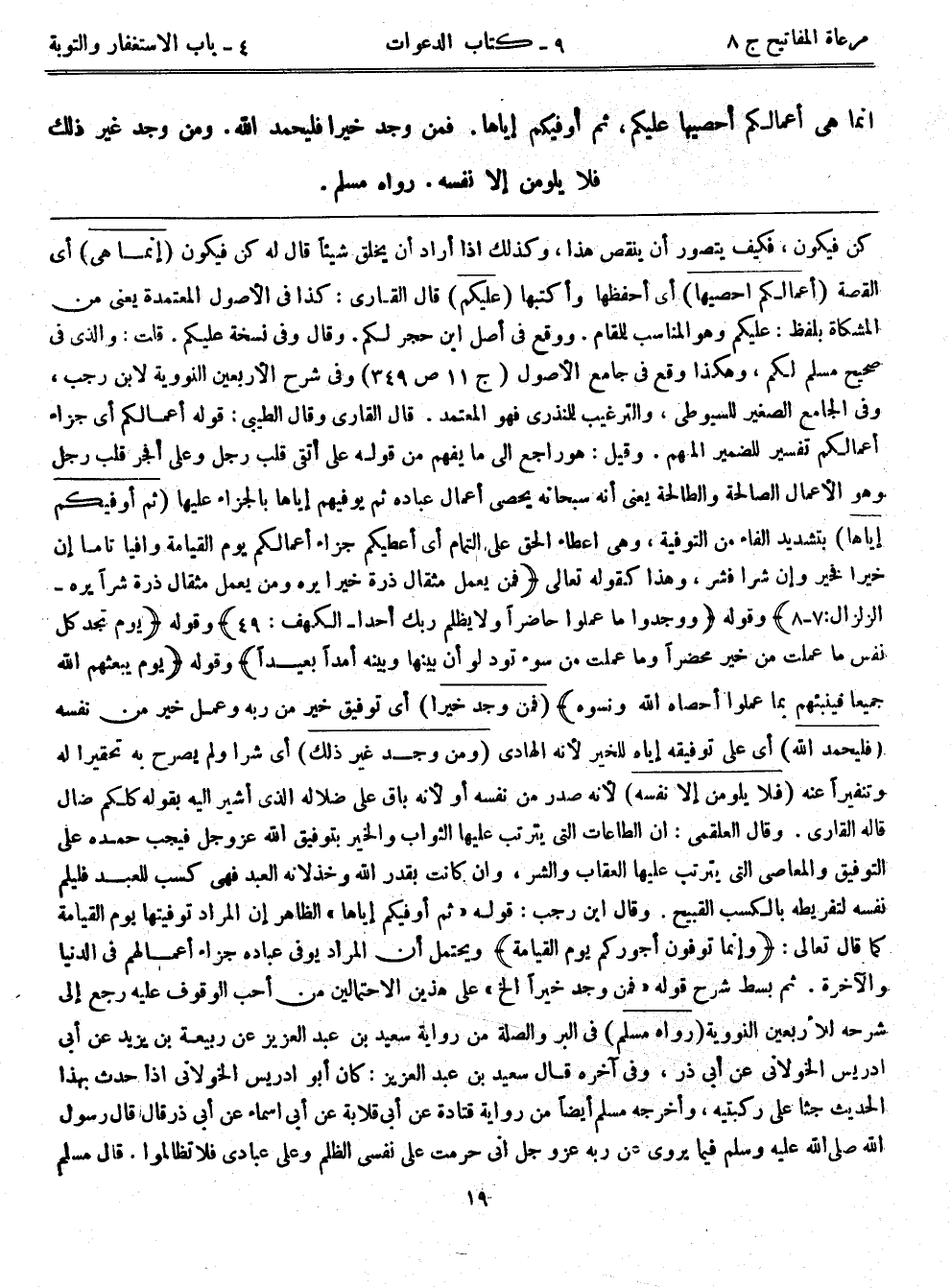 كن فيكون، فكيف يتصور أن ينقص هذا، وكذلك إذا أراد أن يخلق شيئًا قال له: كن فيكون (إنما هي) أي القصة (أعمالكم أحصيها) أي أحفظها وأكتبها (عليكم) قال القاري: كذا في الأصول المعتمدة يعني من المشكاة بلفظ: عليكم وهو المناسب للمقام. ووقع في أصل ابن حجر لكم. وقال وفي نسخة عليكم. قلت: والذي في صحيح مسلم لكم، وهكذا وقع في جامع الأصول (ج11: ص349) وفي شرح الأربعين النووية لابن رجب وفي الجامع الصغير للسيوطي، والترغيب للمنذري فهو المعتمد. قال القاري: وقال الطيبي: قوله: أعمالكم أي جزاء أعمالكم تفسير للضمير المهم. وقيل: هو راجع إلى ما يفهم من قوله: (على أتقى قلب رجل، وعلى أفجر قلب رجل) وهو الأعمال الصالحة والطالحة يعني أنه سبحانه يحصي أعمال عباده ثم يوفيهم إياها بالجزاء عليها (ثم أوفيكم إياها) بتشديد الفاء من التوفية، وهي إعطاء الحق على التمام أي أعطيكم جزاء أعمالكم يوم القيامة وافيًا تامًا إن خيرًا فخير وإن شر فشر، وهذا كقوله تعالى: {فَمَن يَعْمَلْ مِثْقَالَ ذَرَّةٍ خَيْراً يَرَهُ * وَمَن يَعْمَلْ مِثْقَالَ ذَرَّةٍ شَرّاً يَرَهُ} (الزلزلة: 7، 8) وقوله: {وَوَجَدُوا مَا عَمِلُوا حَاضِراً وَلَا يَظْلِمُ رَبُّكَ أَحَداً} (الكهف: 49) وقوله: {يَوْمَ تَجِدُ كُلُّ نَفْسٍ مَّا عَمِلَتْ مِنْ خَيْرٍ مُّحْضَراً وَمَا عَمِلَتْ مِن سُوَءٍ تَوَدُّ لَوْ أَنَّ بَيْنَهَا وَبَيْنَهُ أَمَداً بَعِيداً} وقوله: {يَوْمَ يَبْعَثُهُمُ اللَّهُ جَمِيعاً فَيُنَبِّئُهُم بِمَا عَمِلُوا أَحْصَاهُ اللَّهُ وَنَسُوهُ} (فمن وجد خيرًا) أي: توفيق خير من ربه وعمل خير من نفسه (فليحمد الله) أي: على توفيقه إياه للخير لأنه الهادي (ومن وجد غير ذلك) أي: شرًا ولم يصرح به تحقيرًا له وتنفيرًا عنه (فلا يلومن إلا نفسه) لأنه صدر من نفسه أو لأنه باق على ضلاله الذي أشير إليه بقوله كلكم ضال قاله القاري. وقال العلقمي: إن الطاعات التي يترتب عليها الثواب والخير بتوفيق الله عز وجل فيجب حمده على التوفيق والمعاصي التي يترتب عليها العقاب والشر، وإن كانت بقدر الله وخذلانه العبد فهي كسب للعبد فليلُم نفسه لتفريطه بالكسب القبيح. وقال ابن رجب: قوله: ((ثم أوفيكم إياها)) الظاهر إن المراد توفيتها يوم القيامة كما قال تعالى: {وَإِنَّمَا تُوَفَّوْنَ أُجُورَكُمْ يَوْمَ الْقِيَامَةِ} ويحتمل أن المراد يوفي عباده جزاء أعمالهم في الدنيا والآخرة. ثم بسط شرح قوله: ((فمن وجد خيرًا)) إلخ. على هذين الاحتمالين من أحب الوقوف عليه رجع إلى شرحه للأربعين النووية (رواه مسلم) في البر والصلة من رواية سعيد بن عبد العزيز عن ربيعة بن يزيد عن أبي إدريس الخولاني عن أبي ذر، وفي آخره قال سعيد بن عبد العزيز: كان أبو إدريس الخولاني إذا حدث بهذا الحديث جثا على ركبتيه، وأخرجه مسلم أيضًا من رواية قتادة عن أبي قلابة عن أبي أسماء عن أبي ذر قال: قال رسول الله - صلى الله عليه وسلم - فيما يروى عن ربه عز وجل: إني حرمت على نفسي الظلم وعلى عبادي فلا تظالموا. قال مسلم
