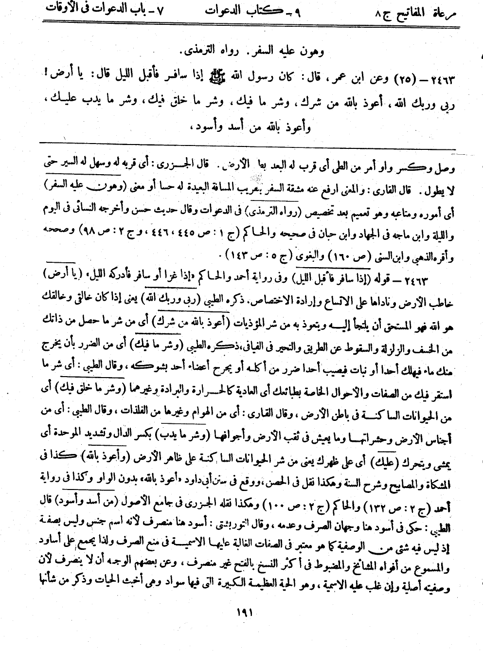 2463- (25) وعَنْ ابْنِ عُمَرٍ قَالَ: كَانَ رَسُولُ اللَّهِ - صلى الله عليه وسلم - إِذَا سَافَرَ فَأَقْبَلَ اللَّيْلُ قَالَ: يَا أَرْضُ رَبِّي وَرَبُّكِ اللَّهُ أَعُوذُ بِاللَّهِ مِنْ شَرِّكِ وَشَرِّ مَا فِيكِ وَشَرِّ مَا خُلِقَ فِيكِ وَشَرِّ مَا يَدِبُّ عَلَيْكِ وَأَعُوذُ بِاللَّهِ مِنْ أَسَدٍ وَأَسْوَدَ