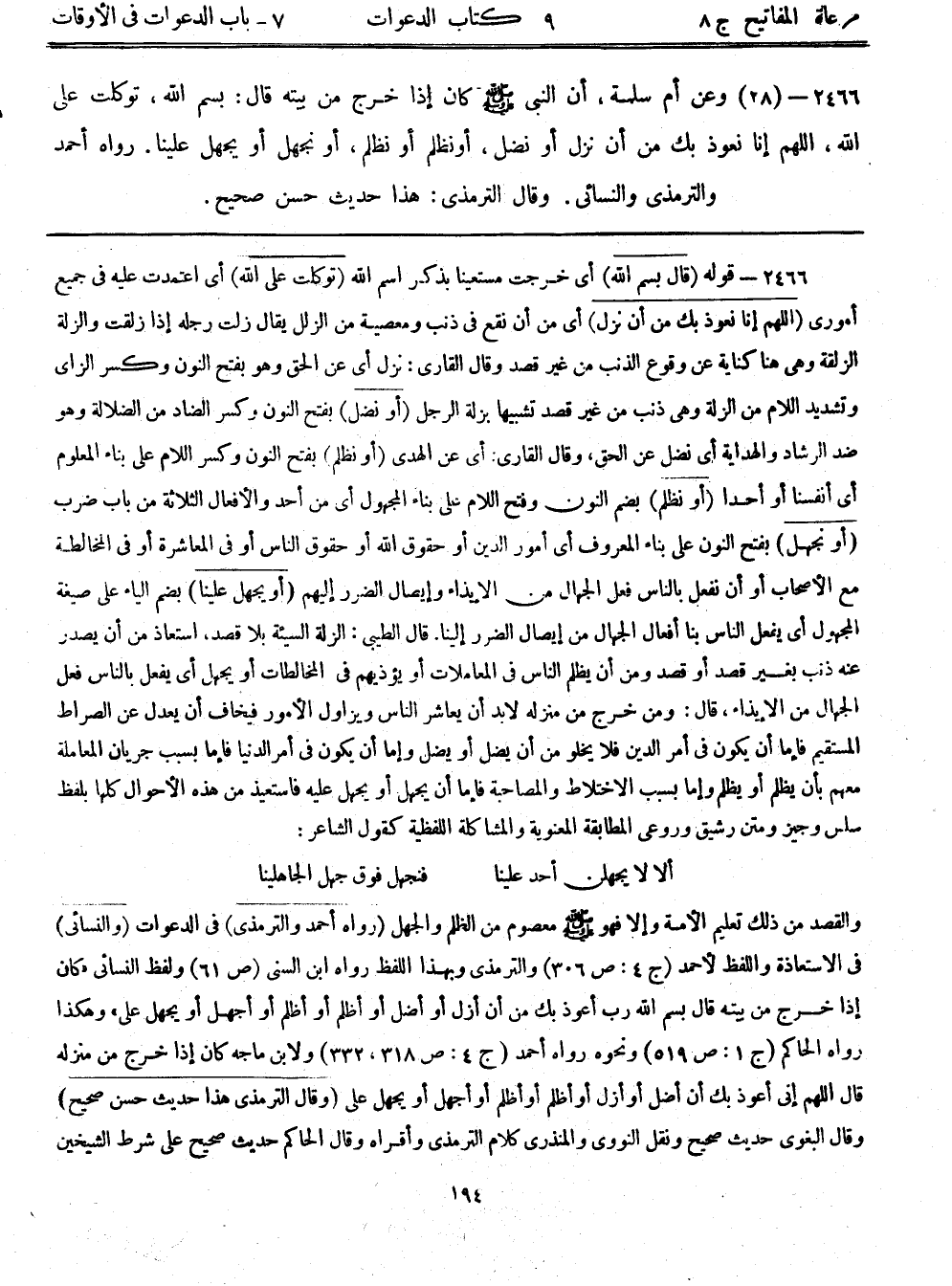 2466- (28) وعَنْ أُمِّ سَلَمَةَ أَنَّ النَّبِيَّ - صلى الله عليه وسلم - كَانَ إِذَا خَرَجَ مِنْ بَيْتِهِ قَالَ: بِسْمِ اللَّهِ تَوَكَّلْتُ عَلَى اللَّهِ اللَّهُمَّ إِنَّا نَعُوذُ بِكَ مِنْ أَنْ نَزِلَّ أَوْ نَضِلَّ أَوْ نَظْلِمَ أَوْ نُظْلَمَ أَوْ نَجْهَلَ أَوْ يُجْهَلَ عَلَيْنَا. رواه أحمد، والترمذي، والنسائي. وقَالَ الترمذي: هَذَا حَدِيثٌ حَسَنٌ صَحِيحٌ.