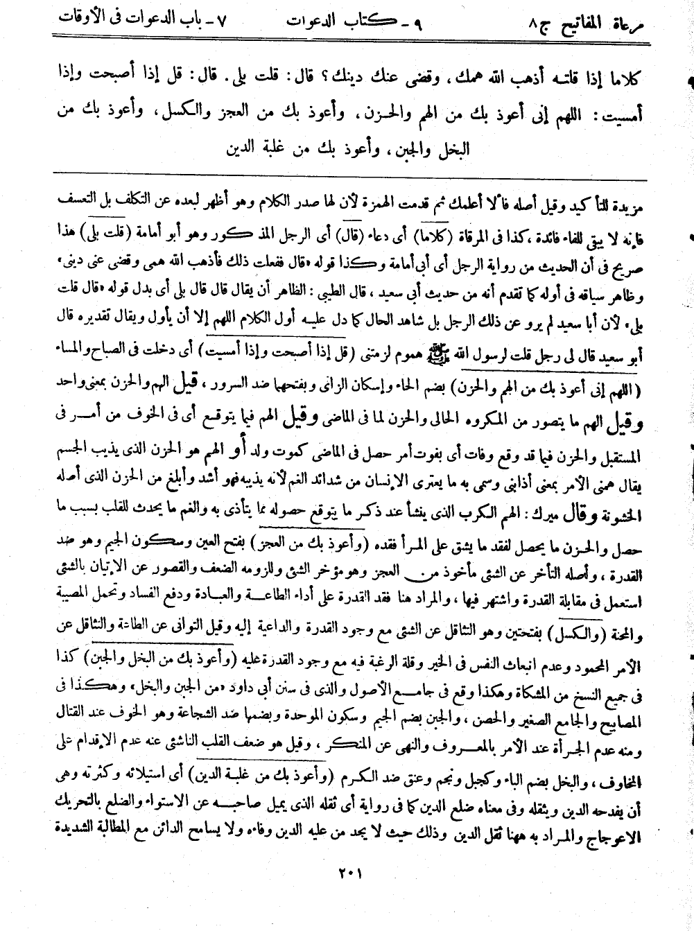 مزيدة للتأكيد وقيل أصله فألا أعلمك ثم قدمت الهمزة لأن لها صدر الكلام وهو أظهر لبعده عن التكلف بل التعسف فإنه لا يبقى للفاء فائدة. كذا في المرقاة (كلامًا) أي دعاء (قال) أي الرجل المذكور وهو أبو أمامة (قلت بلى) هذا صريح في أن الحديث من رواية الرجل أي أبي أمامة وكذا قوله: ((قال: ففعلت ذلك فأذهب الله همي، وقضى عني ديني)) وظاهر سياقه في أوله كما تقدم أنه من حديث أبي سعيد. قال الطيبي: الظاهر أن يقال: قال: قال بلى أي بدل قوله: ((قال: قلت بلى)) لأن أبا سعيد لم يرو عن ذلك الرجل بل شاهد الحال كما دل عليه أول الكلام اللهم إلا أن يأول ويقال تقديره قال أبو سعيد قال لي رجل قلت لرسول الله - صلى الله عليه وسلم - هموم لزمتني (قل إذا أصبحت وإذا أمسيت) أي دخلت في الصباح والمساء (اللهم إني أعوذ بك من الهم والحزن) بضم الحاء وإسكان الزاي وبفتحهما ضد السرور، وقيل: الهم والحزن بمعنى واحد، وقيل: الهم ما يتصور من المكروه الحالي والحزن لما في الماضي، وقيل: الهم فيما يتوقع أي في الخوف من أمرٍ في المستقبل والحزن فيما قد وقع وفات. أي بفوات أمر حصل في الماضي كموت ولد، أو الهم هو الحزن الذي يذيب الجسم، يقال: همني الأمر بمعنى أذابني وسمى به ما يعتري الإنسان من شدائد الغم لأنه يذيبه فهو أشد وأبلغ من الحزن الذي أصله الخشونة، وقال ميرك: الهم الكرب الذي ينشأ عند ذكر ما يتوقع حصوله مما يتأذى به والغم ما يحدث للقلب بسبب ما حصل والحزن ما يحصل لفقد ما يشق على المرأ فقده (وأعوذ بك من العجز) بفتح العين وسكون الجيم وهو ضد القدرة، وأصله التأخر عن الشيء مأخوذ من العجز وهو مؤخر الشيء وللزومه الضعف والقصور عن الإتيان بالشيء استعمل في مقابلة القدرة واشتهر فيها، والمراد هنا فقد القدرة على أداء الطاعة والعبادة ودفع الفساد وتحمل المصيبة والمحنة (والكسل) بفتحتين وهو التثاقل عن الشيء مع وجود القدرة والداعية إليه، وقيل: التواني عن الطاعة والتثاقل عن الأمر المحمود وعدم انبعاث النفس في الخير وقلة الرغبة فيه مع وجود القدرة عليه (وأعوذ بك من البخل والجبن) كذا في جميع النسخ من المشكاة وهكذا وقع في جامع الأصول والذي في سنن أبي داود ((من الجبن والبخل)) وهكذا في المصابيح والجامع الصغير والحصن، والجبن بضم الجيم وسكون الموحدة وبضمها. ضد الشجاعة وهو الخوف عند القتال ومنه عدم الجرأة عند الأمر بالمعروف والنهي عن المنكر، وقيل: هو ضعف القلب الناشئ عنه عدم الإقدام على المخاوف، والبخل بضم الباء وكجبل ونجم وعنق ضد الكرم (وأعوذ بك من غلبة الدين) أي استيلائه وكثرته وهي أن يفدحه الدين ويثقله وفي معناه ضلع الدين كما في رواية أي ثقله الذي يميل صاحبه عن الاستواء والضلع بالتحريك الاعوجاج والمراد به ها هنا ثقل الدين وذلك حيث لا يجد من عليه الدين وفاءه ولا يسامح الدائن مع المطالبة الشديدة