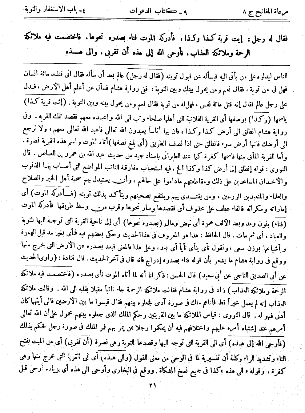 الناس ليدلوه على من يأتي إليه فيسأله عن قبول توبته (فقال له رجل) عالم بعد أن سأله فقال: إني قتلت مائة إنسان فهل لي من توبة، فقال: نعم ومن يحول بينك وبين التوبة. ففي رواية هشام: فسأل عن أعلم أهل الأرض، فدل على رجل عالم فقال إنه قتل مائة نفس فهل له من توبة، فقال: نعم ومن يحول بينه وبين التوبة، (إئت قرية كذا) باسمها (وكذا) بوصفها أي القرية الفلانية التي أهلها صلحاء وتب إلى الله واعبده معهم فقصد تلك القرية. وفي رواية هشام: انطلق إلى أرض كذا وكذا، فإن بها أناسًا يعبدون الله تعالى فاعبد الله تعالى معهم، ولا ترجع إلى أرضك فإنها أرض سوء فانطلق حتى إذا نصف الطريق (أي بلغ نصفها) أتاه الموت. واسم هذه القرية نصرة وأما القرية المأتي منها فاسمها كفرة كما عند الطبراني بإسناد جيد من حديث عبد الله بن عمرو بن العاص. قال النووي: قوله انطلق إلى أرض كذا وكذا إلخ، فيه استحباب مفارقة التائب المواضع التي أصاب بها الذنوب والأخدان المساعدين على ذلك ومقاطعتهم ما داموا على حالهم، وأن يستبدل بهم صحبة أهل الخير والصلاح والعلماء والمتعبدين الورعين، ومن يقتدي بهم وينتفع بصحبتهم ويتأكد بذلك توبته (فأدركه الموت) أي إماراته وسكراته فالفاء عطف على محذوف أي فقصدها وسار نحوها وقرب من وسط طريقها فأدركه الموت (فناء) بنون ومد وبعد الألف همزة أي نهض ومال (بصدره نحوها) أي إلى ناحية القرية التي توجه إليها للتوبة والعباد، أي ثم مات. قال الحافظ: هذا هو المعروف في هذا الحديث وحكى بعضهم فيه فنأى بغير مد قبل الهمزة وبإشباعها بوزن سعى، وتقول نأى ينأى نأيًا أي بعد، وعلى هذا فالمعنى فبعد بصدره عن الأرض التي خرج منها ووقع في رواية هشام ما يشعر بأن قوله فناء بصدره إدراج فإنه قال في آخر الحديث. قال قتادة: (راوي الحديث عن أبي الصديق الناجي عن أبي سعيد) قال الحسن: ذكر لنا أنه لما أتاه الموت نأى بصدره (فاختصمت فيه ملائكة الرحمة وملائكة العذاب) زاد في رواية هشام: فقالت ملائكة الرحمة: جاء تائبًا مقبلاً بقلبه إلى الله. وقالت ملائكة العذاب: إنه لم يعمل خيرًا قط فأتاهم ملك في صورة آدمي فجعلوه بينهم فقال: قيسوا ما بين الأرضين فإلى أيتهما كان أدنى فهو له. قال النووي: قياس الملائكة ما بين القريتين وحكم الملك الذي جعلوه بينهم محمول على أن الله تعالى أمرهم عند اشتباه أمره عليهم واختلافهم فيه أن يحكموا رجلاً ممن يمر بهم فمر الملك في صورة رجل فحكم بذلك (فأوحى الله إلى هذه) أي إلى القرية التي توجه إليها وقصدها للتوبة وهي نصرة (أن تقربي) أي من الميت بفتح التاء وتشديد الراء وكلمة أن تفسيرية لما في الوحي من معنى القول: (وإلى هذه) أي إلى القرية التي خرج منها وهي كفرة، وقوله: ((إلى هذه)) كذا في جميع نسخ المشكاة. ووقع في البخاري وأوحى إلى هذه أي بزيادة وحى قبل