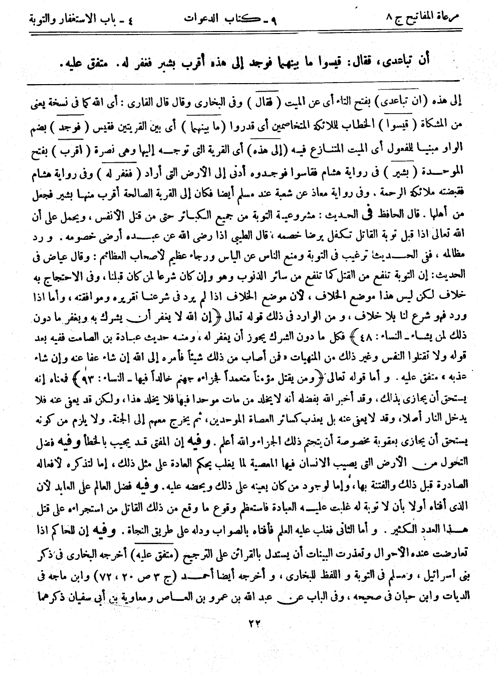 إلى هذه (أن تباعدي) بفتح التاء أي عن الميت (فقال) وفي البخاري وقال: قال القاري: أي الله كما في نسخة يعني من المشكاة (قيسوا) الخطاب للملائكة المتخاصمين أي قدروا (ما بينهما) أي بين القريتين فقيس (فوجد) بضم الواو مبنيًا للمفعول أي الميت المتنازع فيه (إلى هذه) أي القرية التي توجه إليها وهي نصرة (أقرب) بفتح الموحدة (بشبر) في رواية هشام: فقاسوا فوجدوه أدنى إلى الأرض التي أراد، (فغفر له) وفي رواية هشام: فقبضته ملائكة الرحمة. وفي رواية معاذ عن شعبة عند مسلم أيضًا: فكان إلى القرية الصالحة أقرب منها بشبر فجعل من أهلها. قال الحافظ في الحديث: مشروعية التوبة من جميع الكبائر حتى من قتل الأنفس، ويحمل على أن الله تعالى إذا قبل توبة القاتل تكفل برضا خصمه، قال الطيبي إذا رضي الله عن عبده أرضى خصومه. ورد مظالمه، ففي الحديث ترغيب في التوبة ومنع الناس عن اليأس ورجاء عظيم لأصحاب العظائم: وقال عياض في الحديث: إن التوبة تنفع من القتل كما تنفع من سائر الذنوب وهو وإن كان شرعًا لمن كان قبلنا، وفي الاحتجاج به خلاف لكن ليس هذا موضع الخلاف، لأن موضع الخلاف إذا لم يرد في شرعنا تقريره وموافقته، وأما إذا ورد فهو شرع لنا بلا خلاف، ومن الوارد في ذلك قوله تعالى: {إِنَّ اللهَ لاَ يَغْفِرُ أَن يُشْرَكَ بِهِ وَيَغْفِرُ مَا دُونَ ذَلِكَ لِمَن يَشَاءُ} (النساء: 48) فكل ما دون الشرك يجوز أن يغفر له، ومنه حديث عبادة بن الصامت ففيه بعد قوله: ولا تقتلوا النفس وغير ذلك من المنهيات ((فمن أصاب من ذلك شيئًا فأمره إلى الله إن شاء عفا عنه وإن شاء عذبه)) متفق عليه. وأما قوله تعالى: {وَمَن يَقْتُلْ مُؤْمِناً مُّتَعَمِّداً فَجَزَآؤُهُ جَهَنَّمُ خَالِداً فِيهَا} (النساء: 93) فمعناه أنه يستحق أن يجازى بذلك، وقد أخبر الله بفضله أنه لا يخلد من مات موحدًا فيها فلا يخلد هذا، ولكن قد يعفي عنه فلا يدخل النار أصلاً، وقد لا يعفي عنه بل يعذب كسائر العصاة الموحدين، ثم يخرج معهم إلى الجنة , ولا يلزم من كونه يستحق أن يجازى بعقوبة مخصوصة أن يتحتم ذلك الجزاء والله أعلم. وفيه: إن المفتي قد يجيب بالخطأ وفيه: فضل التحول من الأرض التي يصيب الإنسان فيها المعصية لما يغلب بحكم العادة على مثل ذلك، إما لتذكره لأفعاله الصادرة قبل ذلك والفتنة بها، وإما لوجود من كان يعينه على ذلك ويحضه عليه. وفيه: فضل العالم على العابد لأن الذي أفتاه أولاً بأن لا توبة له غلبت عليه العبادة فاستعظم وقوع ما وقع من ذلك القاتل من استجراءه على قتل هذا العدد الكثير. وأما الثاني: فغلب عليه العلم فأفتاه بالصواب ودله على طريق النجاة. وفيه: إن للحاكم إذا تعارضت عنده الأحوال وتعذرت البينات أن يستدل بالقرائن على الترجيح. (متفق عليه) أخرجه البخاري في ذكر بني إسرائيل، ومسلم في التوبة واللفظ للبخاري، وأخرجه أيضًا أحمد (ج3: ص20: 72) ، وابن ماجة في الديات، وابن حبان في صحيحه، وفي الباب عن عبد الله بن عمرو بن العاص ومعاوية بن أبي سفيان ذكرهما