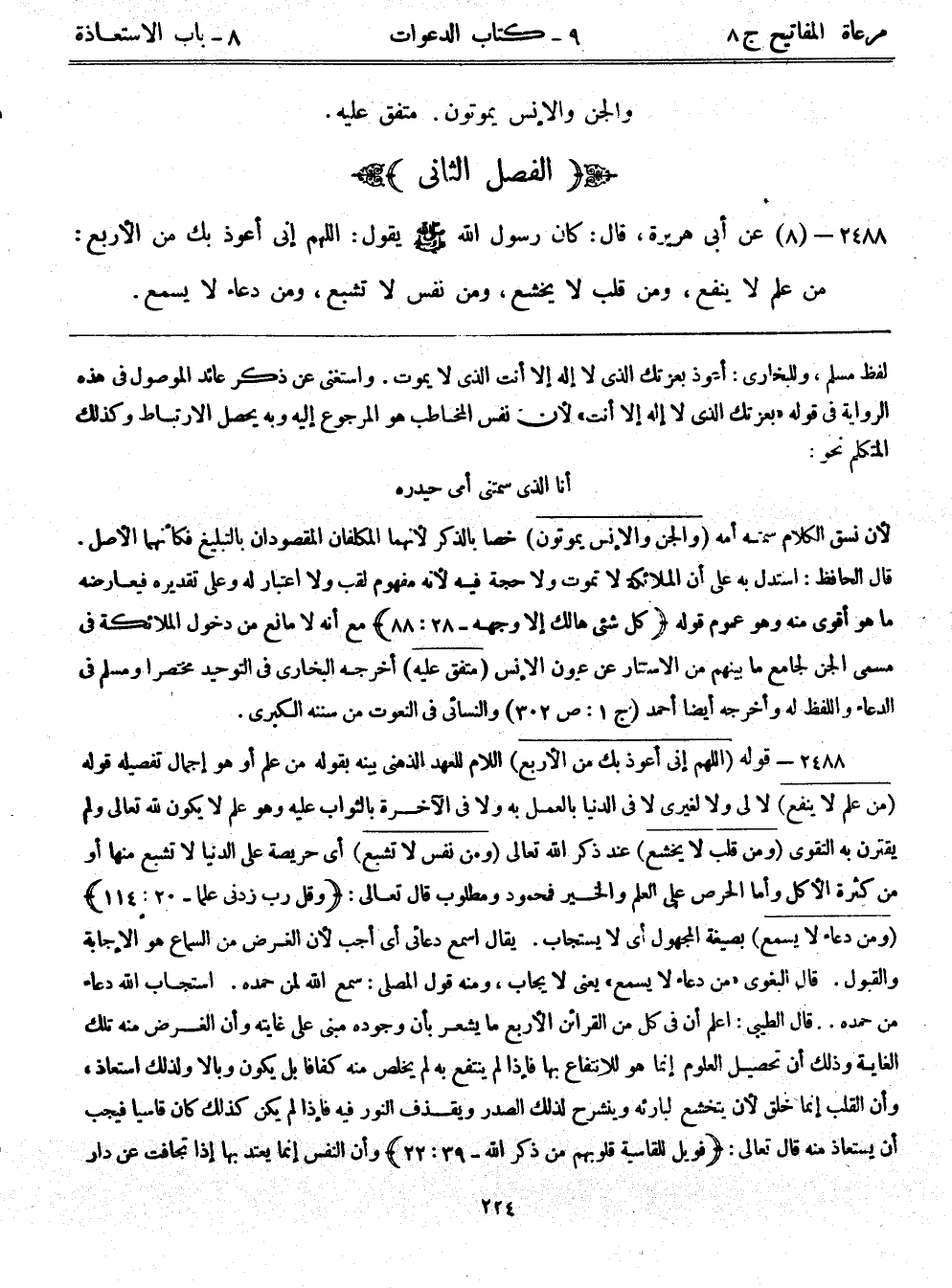 2488- (8) عَنْ أَبِي هُرَيْرَةَ قَالَ: كَانَ رَسُولُ اللَّهِ - صلى الله عليه وسلم - يَقُولُ: اللَّهُمَّ إِنِّي أَعُوذُ بِكَ مِنْ الْأَرْبَعِ: مِنْ عِلْمٍ لَا يَنْفَعُ وَمِنْ قَلْبٍ لَا يَخْشَعُ وَمِنْ نَفْسٍ لَا تَشْبَعُ وَمِنْ دُعَاءٍ لَا يُسْمَعُ.