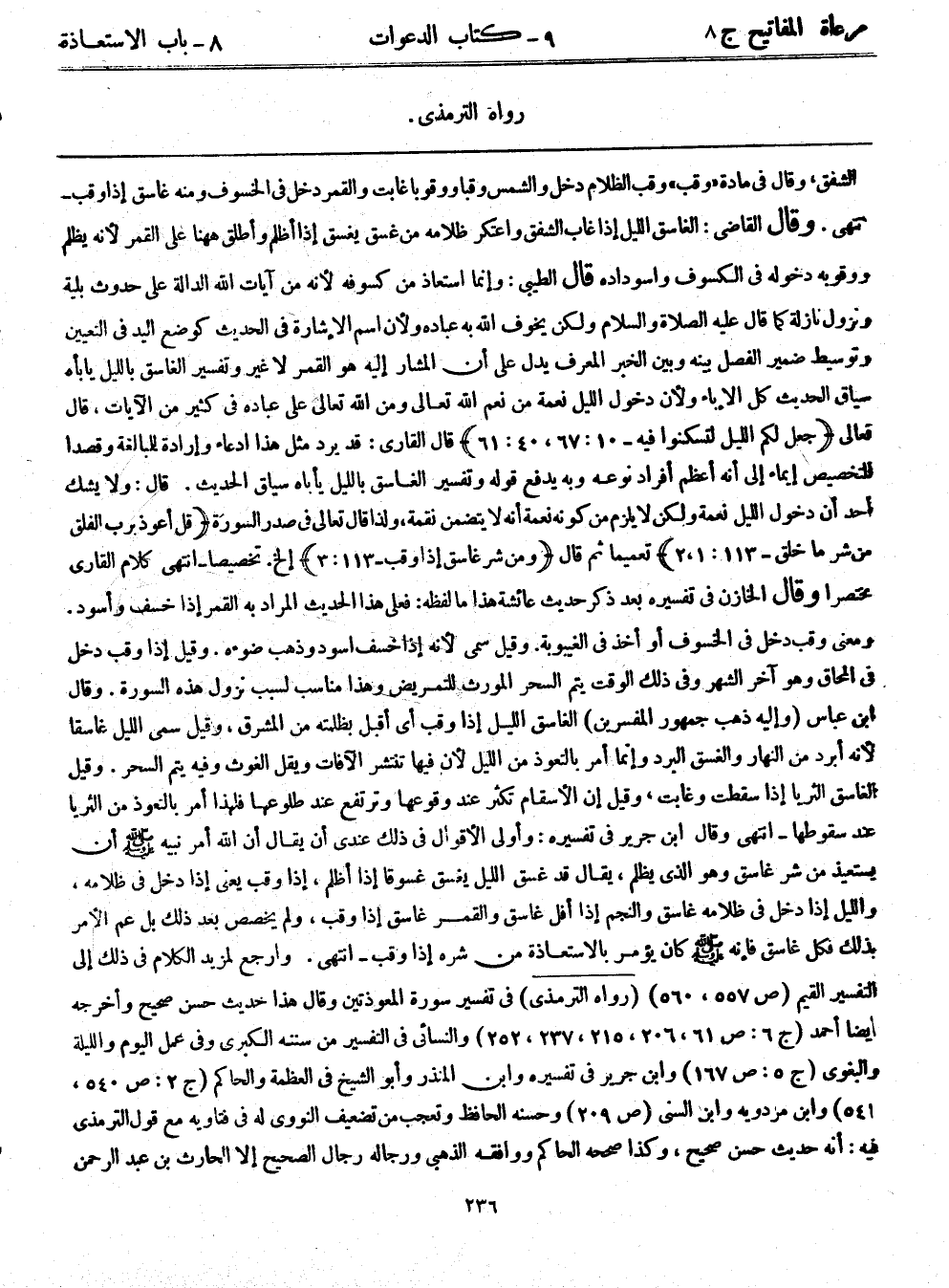 الشفق، وقال في مادة ((وقب)) وقب الظلام دخل والشمس وقبا ووقوبًا غابت والقمر دخل في الخسوف ومنه غاسق إذا وقب. - انتهى. وقال القاضي: الغاسق الليل إذا غاب الشفق واعتكر ظلامه من غسق يغسق إذا أظلم وأطلق ها هنا على القمر لأنه يظلم ووقوبه دخوله في الكسوف واسوداده. قال الطيبي: وإنما استعاذ من كسوفه لأنه من آيات الله الدالة على حدوث بلية ونزول نازلة كما قال عليه الصلاة والسلام ولكن يخوف الله به عباده ولأن اسم الإشارة في الحديث كوضع اليد في التعيين وتوسيط ضمير الفصل بينه وبين الخبر المعروف يدل على أن المشار إليه هو القمر لا غير وتفسير الغاسق بالليل يأباه سياق الحديث كل الإباء ولأن دخول الليل نعمة من نعم الله تعالى ومن الله تعالى على عباده في كثير من الآيات، قال تعالى: {جَعَلَ لَكُمُ اللَّيْلَ لِتَسْكُنُوا فِيهِ} (10: 67، 40: 61) قال القاري: قد يرد مثل هذا ادعاء وإرادة للمبالغة وقصدًا للتخصيص إيماء إلى أنه أعظم أفراد نوعه وبه يدفع قوله وتفسير الغاسق بالليل يأباه سياق الحديث. قال: ولا يشك أحد أن دخول الليل نعمة ولكن لا يلزم من كونه نعمة أنه لا يتضمن نقمة، ولذا قال تعالى في صدر السورة {قُلْ أَعُوذُ بِرَبِّ الْفَلَقِ مِن * شَرِّ مَا خَلَقَ} (113: 1، 2) تعميمًا ثم قال {وَمِن شَرِّ غَاسِقٍ إِذَا وَقَبَ} (113: 3) إلخ. تخصيصًا - انتهى كلام القاري مختصرًا. وقال الخازن: في تفسيره بعد ذكر حديث عائشة هذا ما لفظه: فعلى هذا الحديث المراد به القمر إذا خسف وأسود. ومعنى وقب دخل في الخسوف أو أخذ في الغيبوبة. وقيل سمي لأنه إذا خسف اسود وذهب ضوءه. وقيل إذا وقب دخل في المحاق وهو آخر الشهر وفي ذلك الوقت يتم السحر المورث للتمريض وهذا مناسب لسبب نزول هذه السورة. وقال ابن عباس (وإليه ذهب جمهور المفسرين) الغاسق الليل إذا وقب، أي أقبل بظلمته من المشرق، وقيل سمي الليل غاسقًا لأنه أبرد من النهار والغسق البرد وإنما أمر بالتعوذ من الليل لأن فيها تنتشر الآفات ويقل الغوث وفيه يتم السحر. وقيل: الغاسق الثريا إذا سقطت وغابت، وقيل إن الأسقام تكثر عند وقوعها وترتفع عند طلوعها فلهذا أمر بالتعوذ من الثريا عند سقوطها - انتهى. وقال ابن جرير في تفسيره: ولأولى الأقوال في ذلك عندي أن يقال أن الله أمر نبيه - صلى الله عليه وسلم - أن يستعيذ من شر غاسق وهو الذي يظلم، يقال قد غسق الليل يغسق غسوقًا إذا أظلم، إذا وقب يعني إذا دخل في ظلامه، والليل إذا دخل في ظلامه غاسق والنجم إذا أفل غاسق والقمر غاسق إذا وقب، ولم يخصص بعد ذلك بل عم الأمر بذلك فكل غاسق فإنه - صلى الله عليه وسلم - كان يؤمر بالاستعاذة من شره إذا وقب - انتهى. وارجع لمزيد الكلام في ذلك إلى التفسير القيم (ص557،560) (رواه الترمذي) ، في تفسير سورة المعوذتين وقال هذا حديث حسن صحيح وأخرجه أيضًا أحمد (ج6: ص 61، 206، 215، 237، 252) ، والنسائي في التفسير من سننه الكبرى وفي عمل اليوم والليلة، والبغوي (ج5: ص167) ، وابن جرير في تفسيره، وابن المنذر، وأبو الشيخ في العظمة، والحاكم (ج2: ص540، 541) ، وابن مردويه، وابن السني (ص209) ، وحسنه الحافظ وتعجب من تضعيف النووي له في فتاويه مع قول الترمذي فيه: أنه حديث حسن صحيح، وكذا صححه الحاكم ووافقه الذهبي ورجاله رجال الصحيح إلا الحارث بن عبد الرحمن
